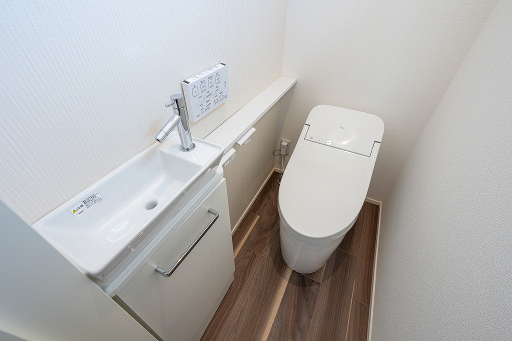 1階トイレは、来客時にも便利な独立手洗い器付。コンパクトながら奥深くまで手を入れやすい形状で、水はねしにくくしっかり手洗いできます。