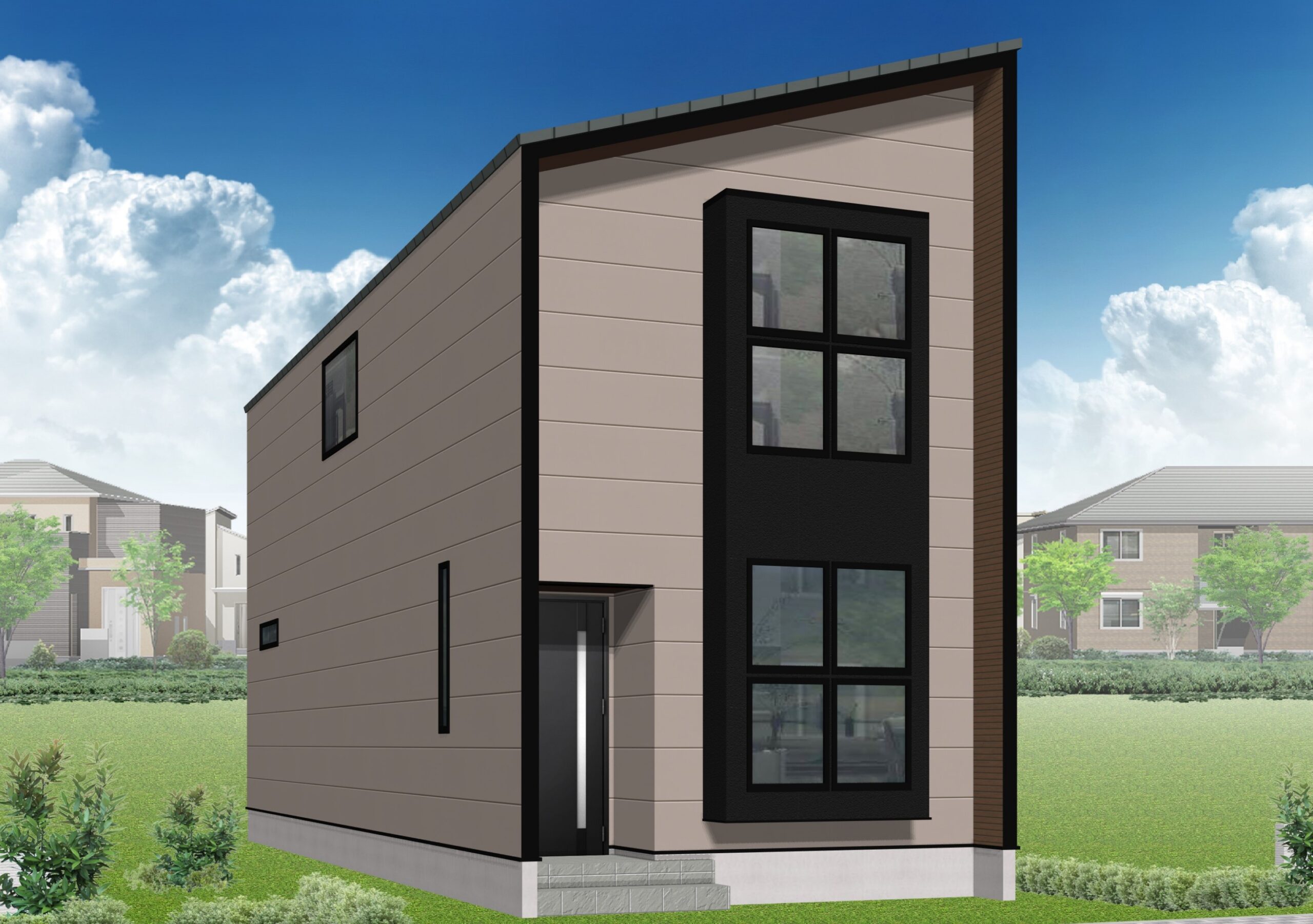 シャープな片流れ屋根とブラックのアクセントが映える、モダンな外観。大きな窓が光を取り込み、シンプルまがらもデザイン性と開放感を兼ね備えた一邸です💫