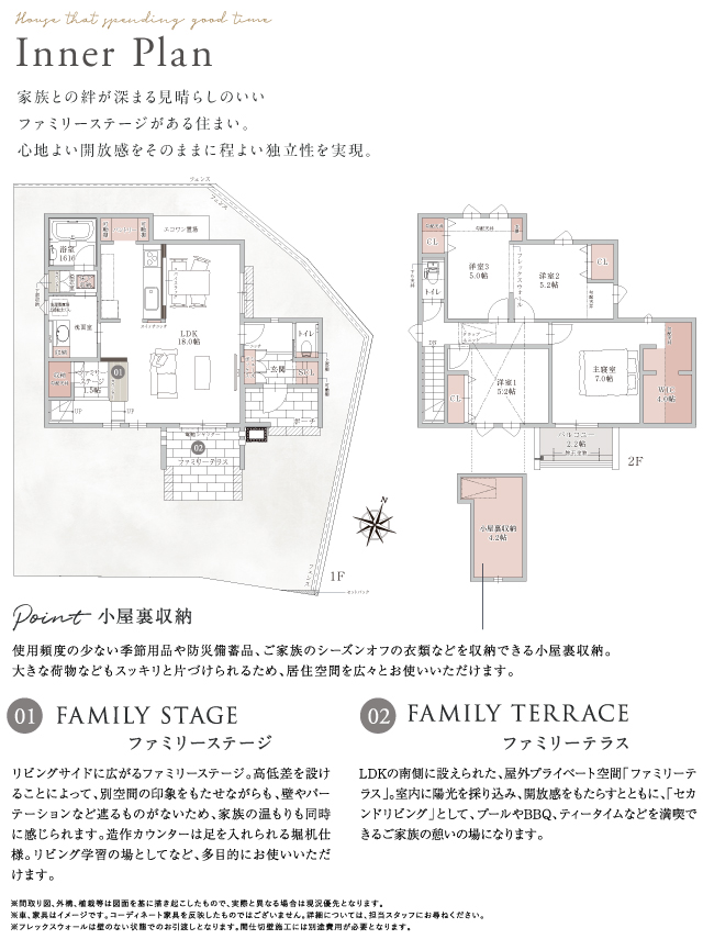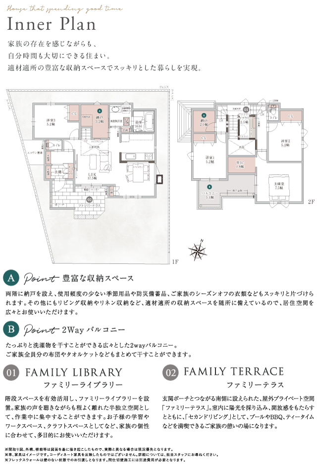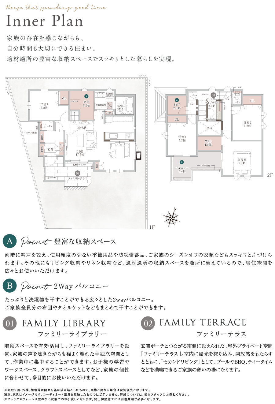 住まいには、家族の繋がりを大切にしたファミリーライブラリーやテラス等の+α空間・豊富な収納スペース・