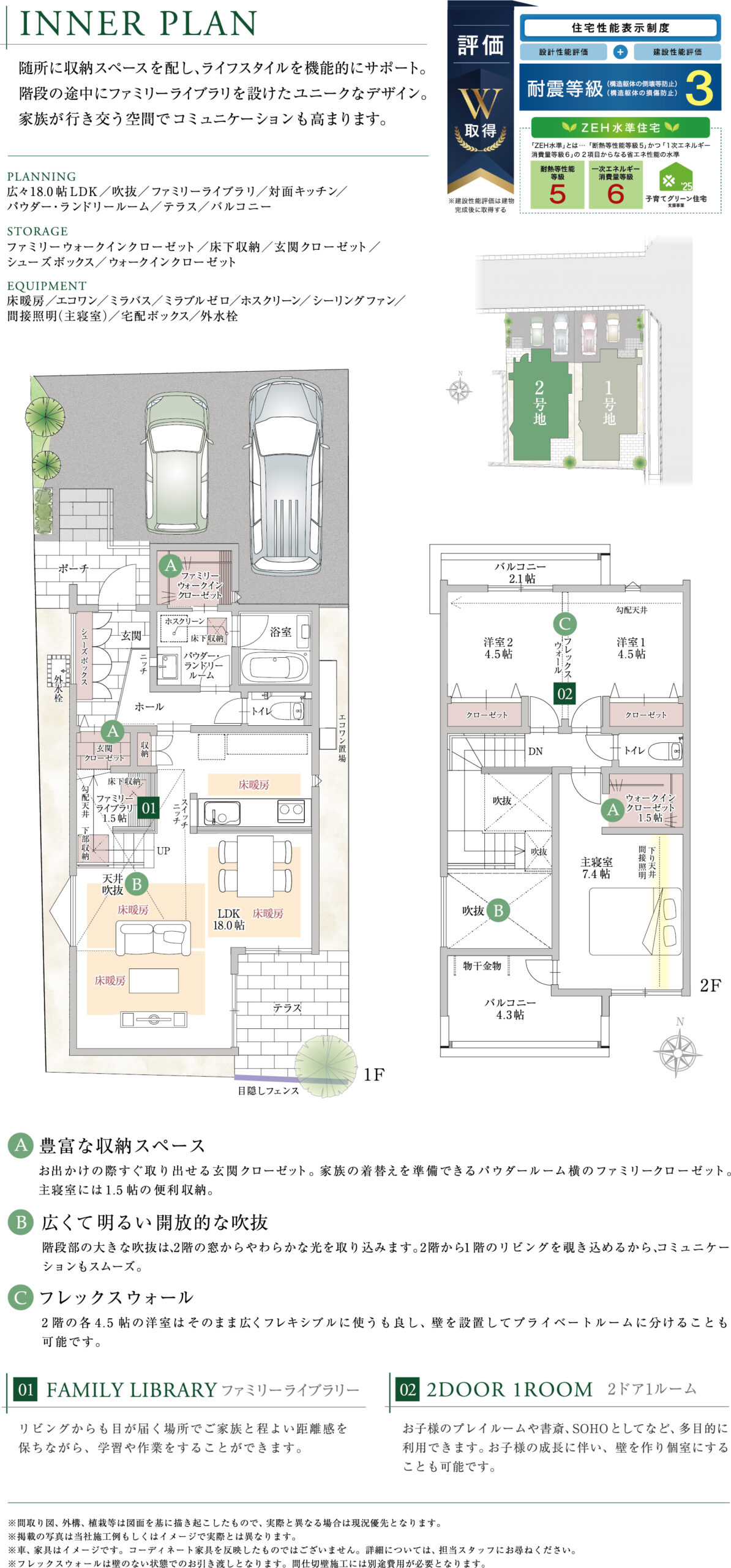 住まいには、人気のテラスや吹き抜け、ファミリーライブラリー等こだわりの+α空間を設けました。