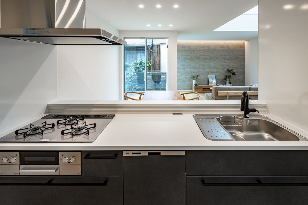 腰壁の付いた対面キッチン。 腰壁は調理作業中の手元を隠したり、調理に使う食材や調味料、調理グッズの散らかりを隠したりするのに役立ちます。