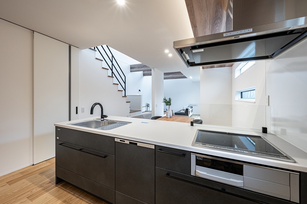 開放感のあるフルフラットキッチンは、すっきりと美しいデザインが魅力。料理をしながらリビングにいる家族の様子を見守れ、自然と会話も生まれます。毎日の暮らしを快適にする機能性と、心地よい時間を演出するデザイン性を兼ね備えたキッチンです。
