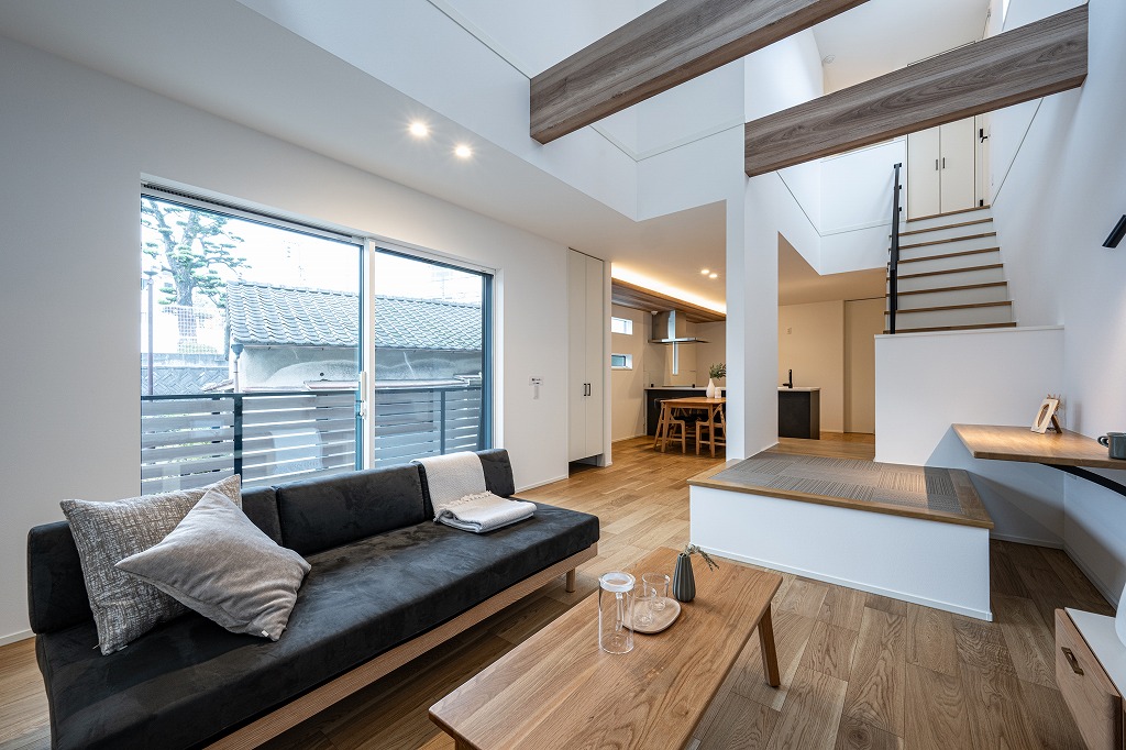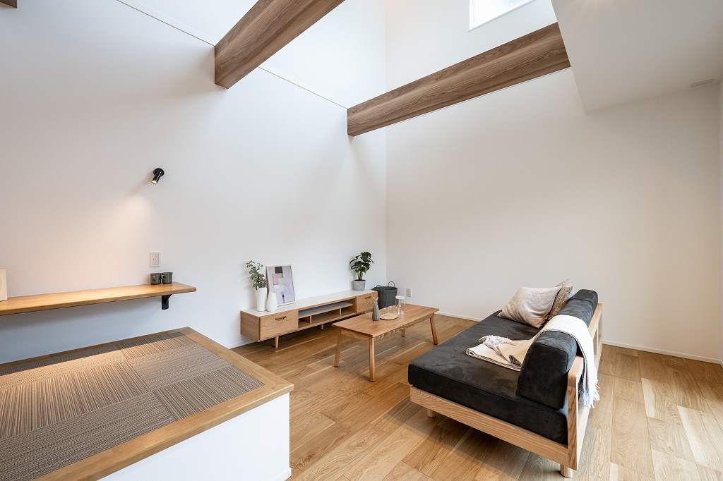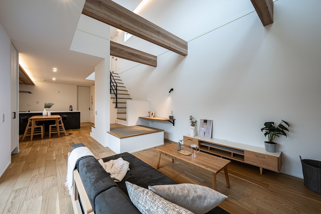 住まいには、吹き抜けや傾斜天井で開放感溢れるリビングと共に、