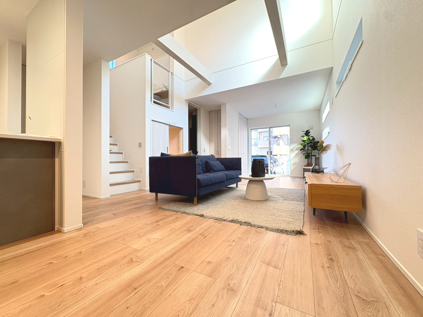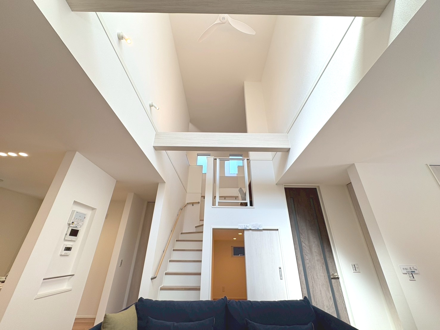 吹抜けから光と風が通り抜ける17.5帖の広々リビング。家族の毎日が心地よく広がります☘️