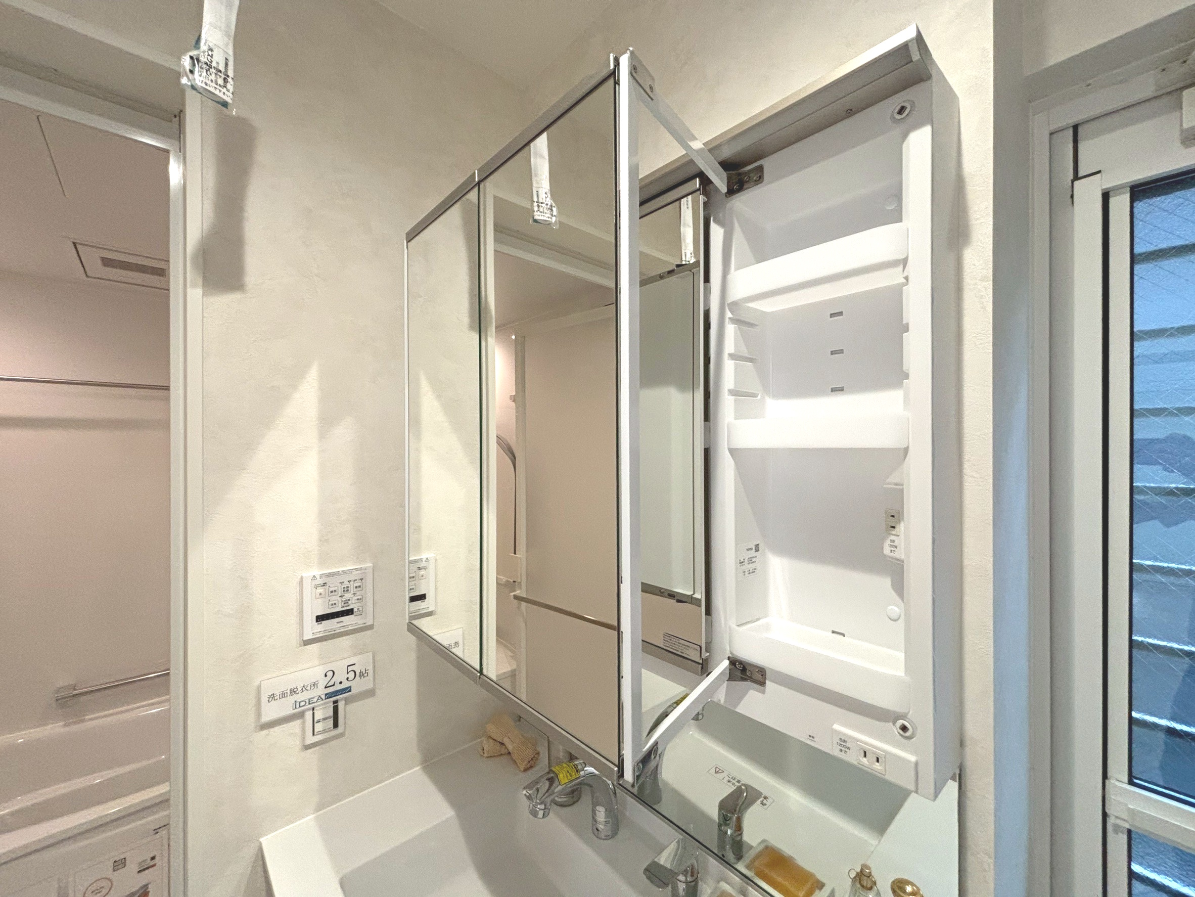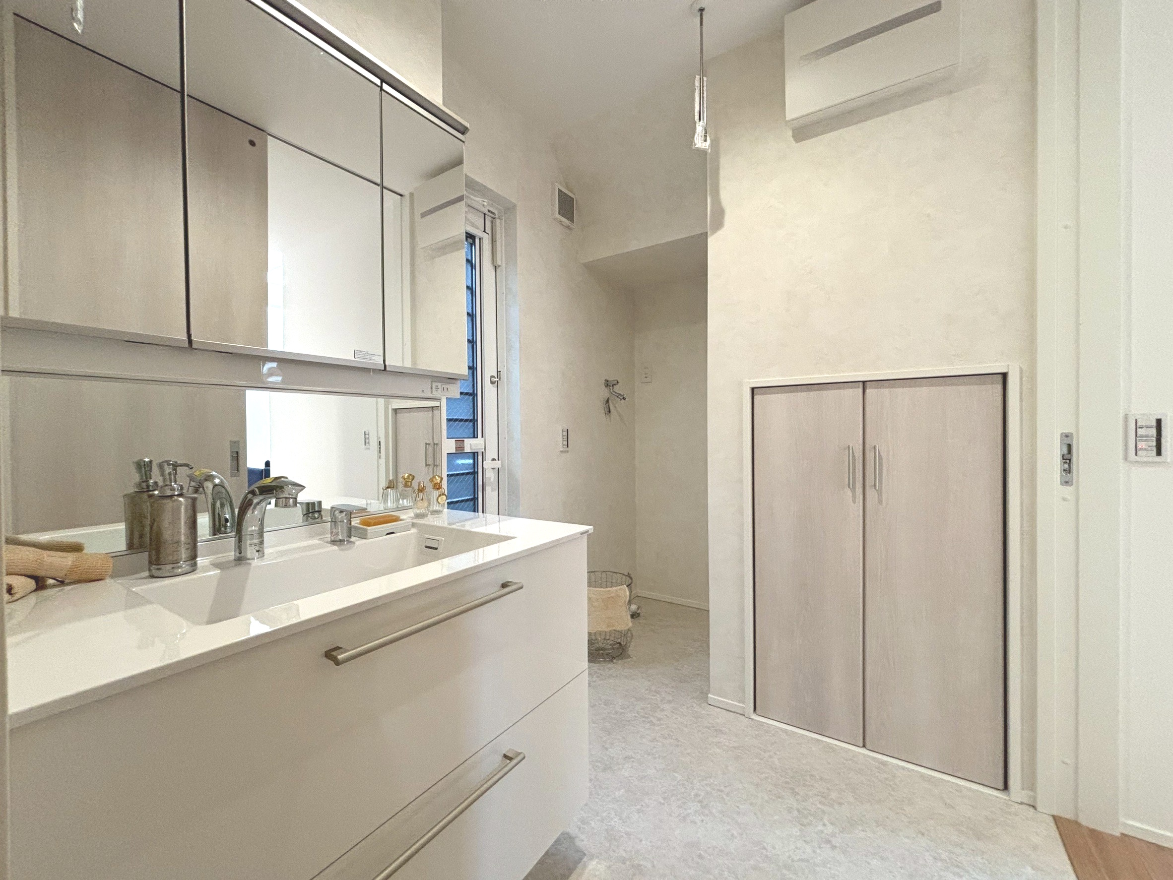 ホスクリーン付きで天候や花粉を気にせず室内干しOK。三面鏡付き洗面台は、、使い勝手と収納力を兼ね備えています☘️