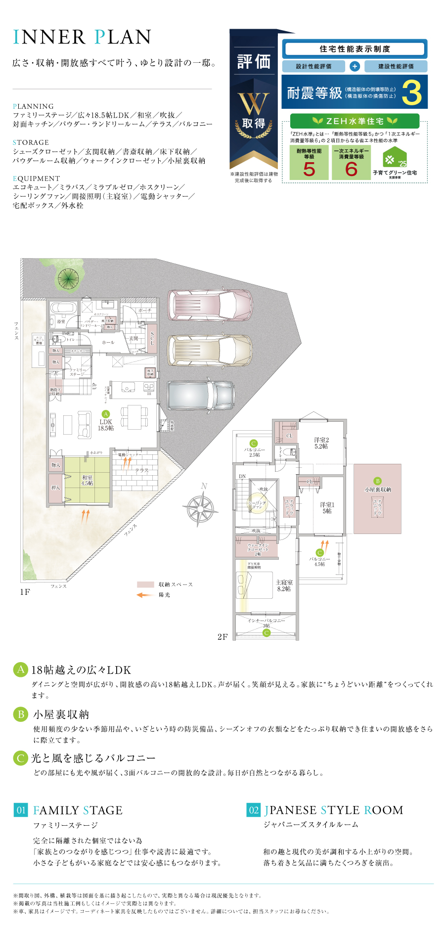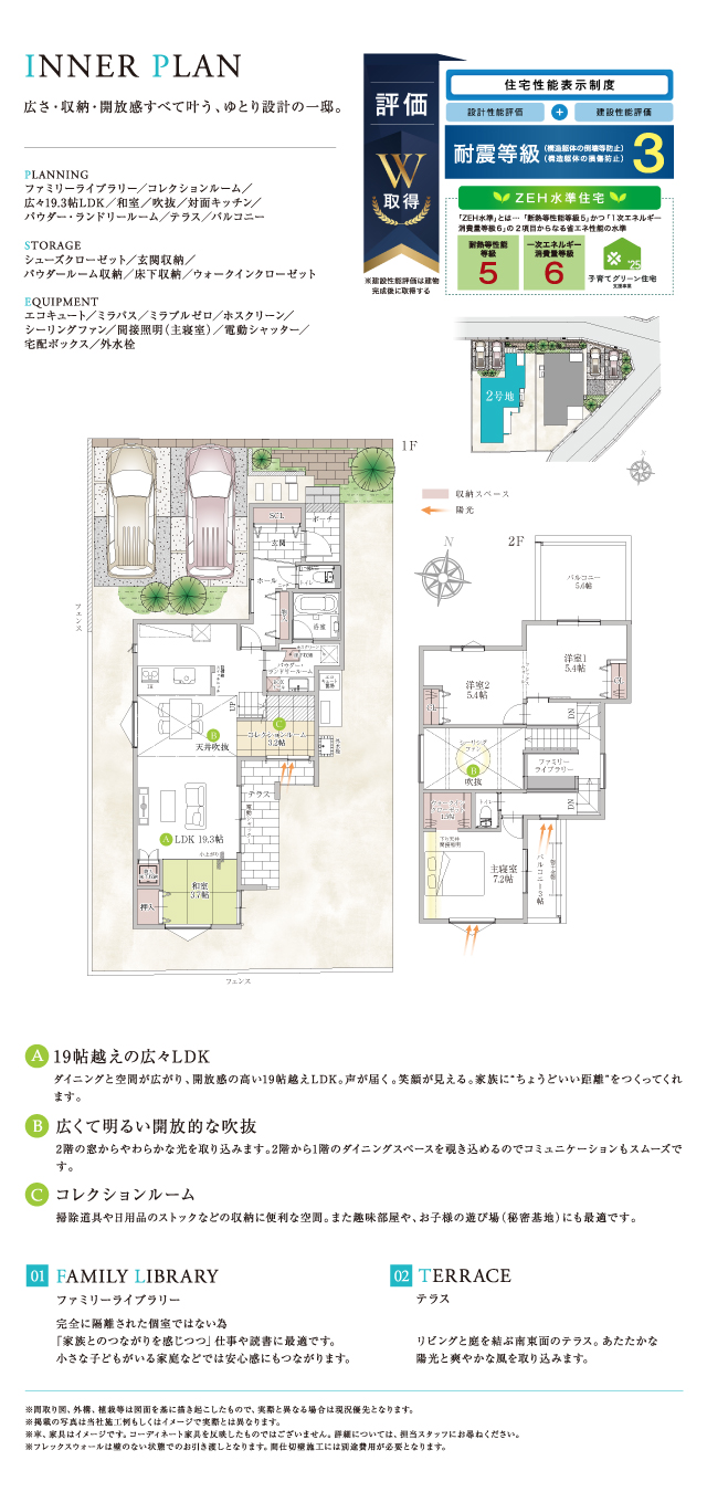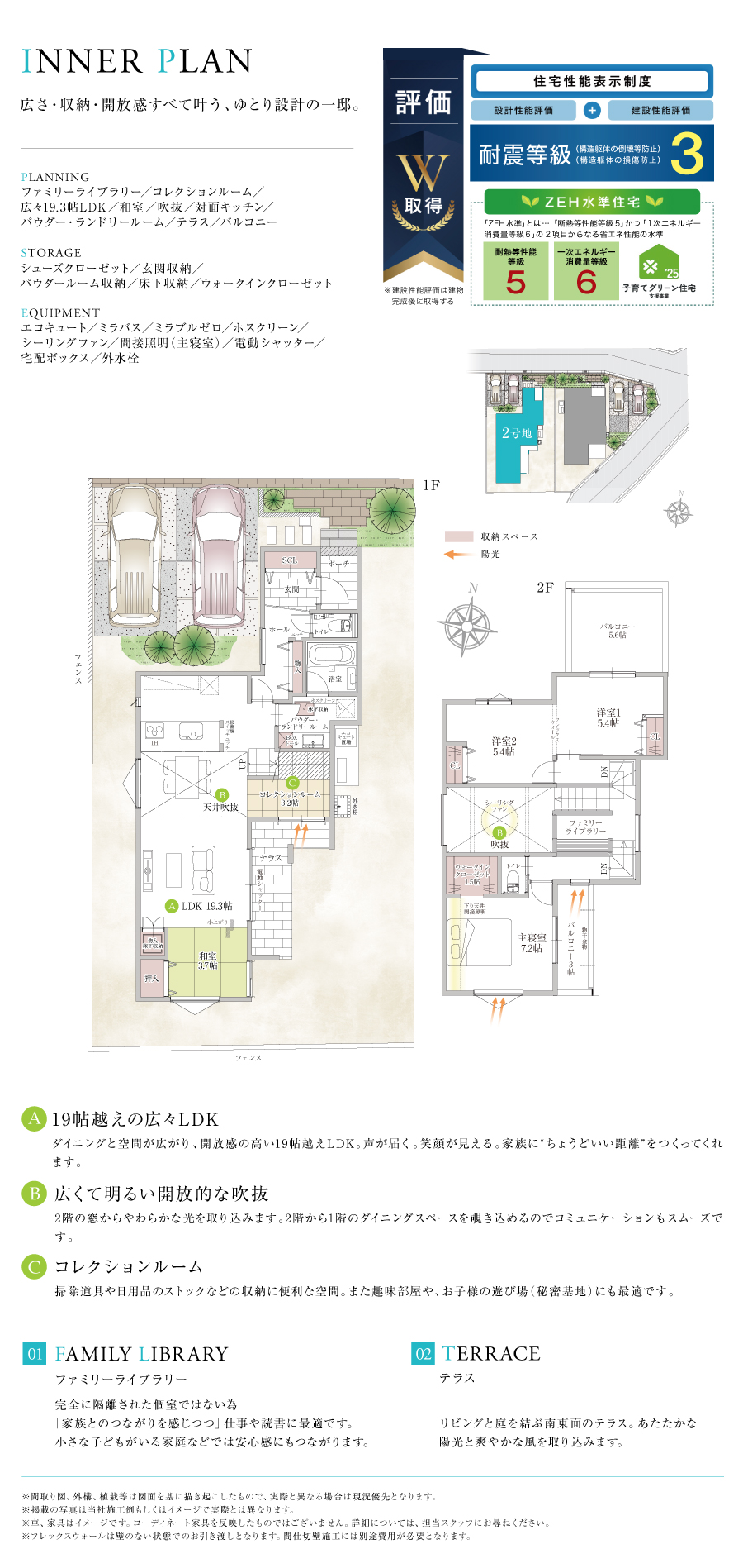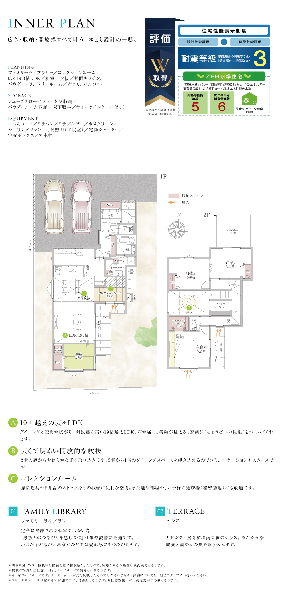 設計性能評価&建設性能評価W取得! 国が定めた住宅性能表示制度において、以下の項目で等級を取得しております。 ・耐震等級3(構造躯体の倒壊等防止) ・耐震等級3(構造躯体の損傷防止) ・一次エネルギー消費量等級6 ・断熱等性能等級5