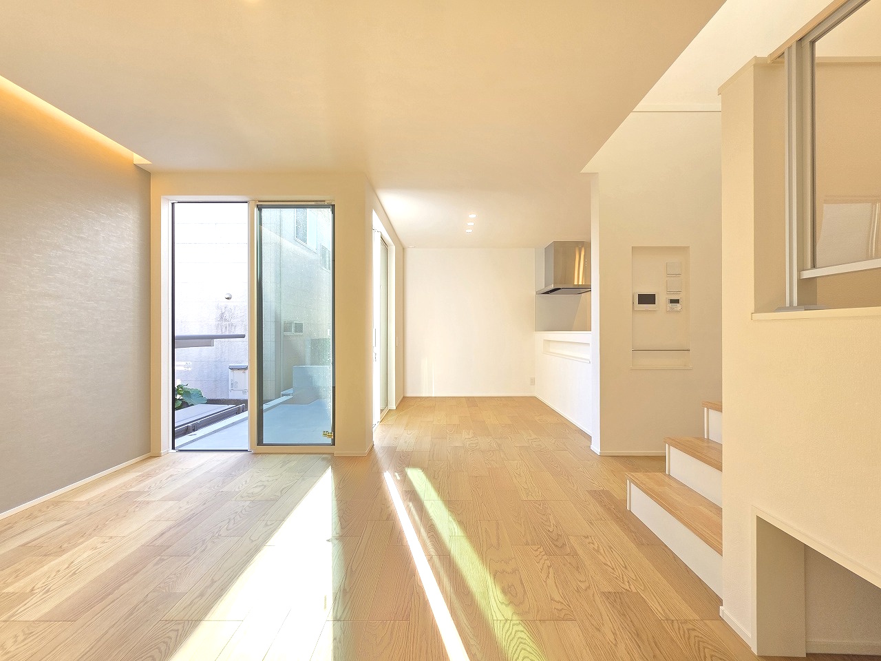 LDKに陽光をもたらし、明るく開放感溢れる空間に。吹抜けが織りなす上質な寛ぎの邸宅。家族の時間を深めるリビングルームです。