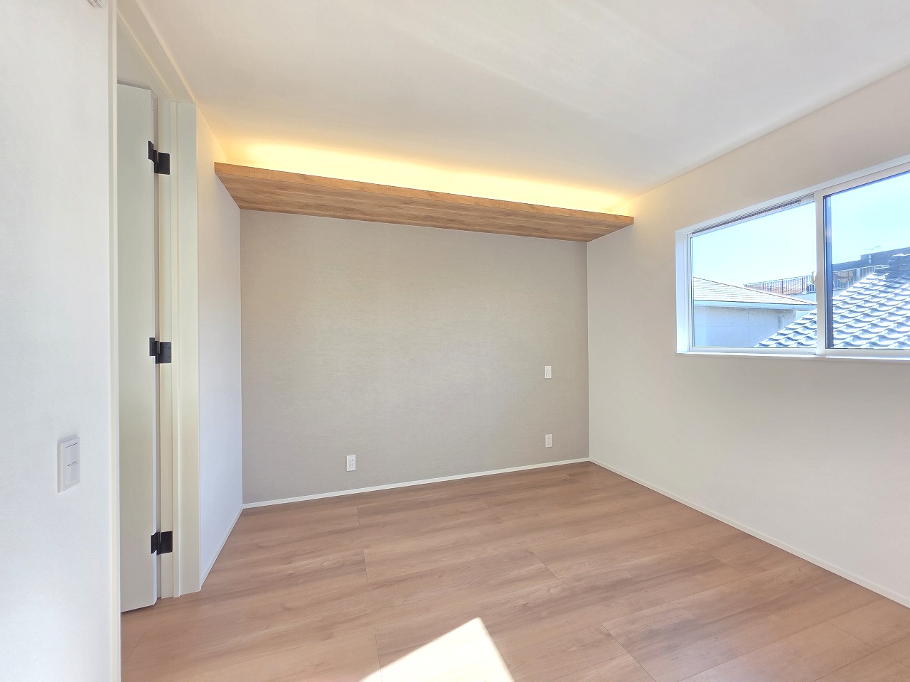 ダブルベッドを置いてもゆとりある広々主寝室。天井の間接照明がやさしく照らし、落ち着いた雰囲気の中で、心地よい眠りへと導きます。
