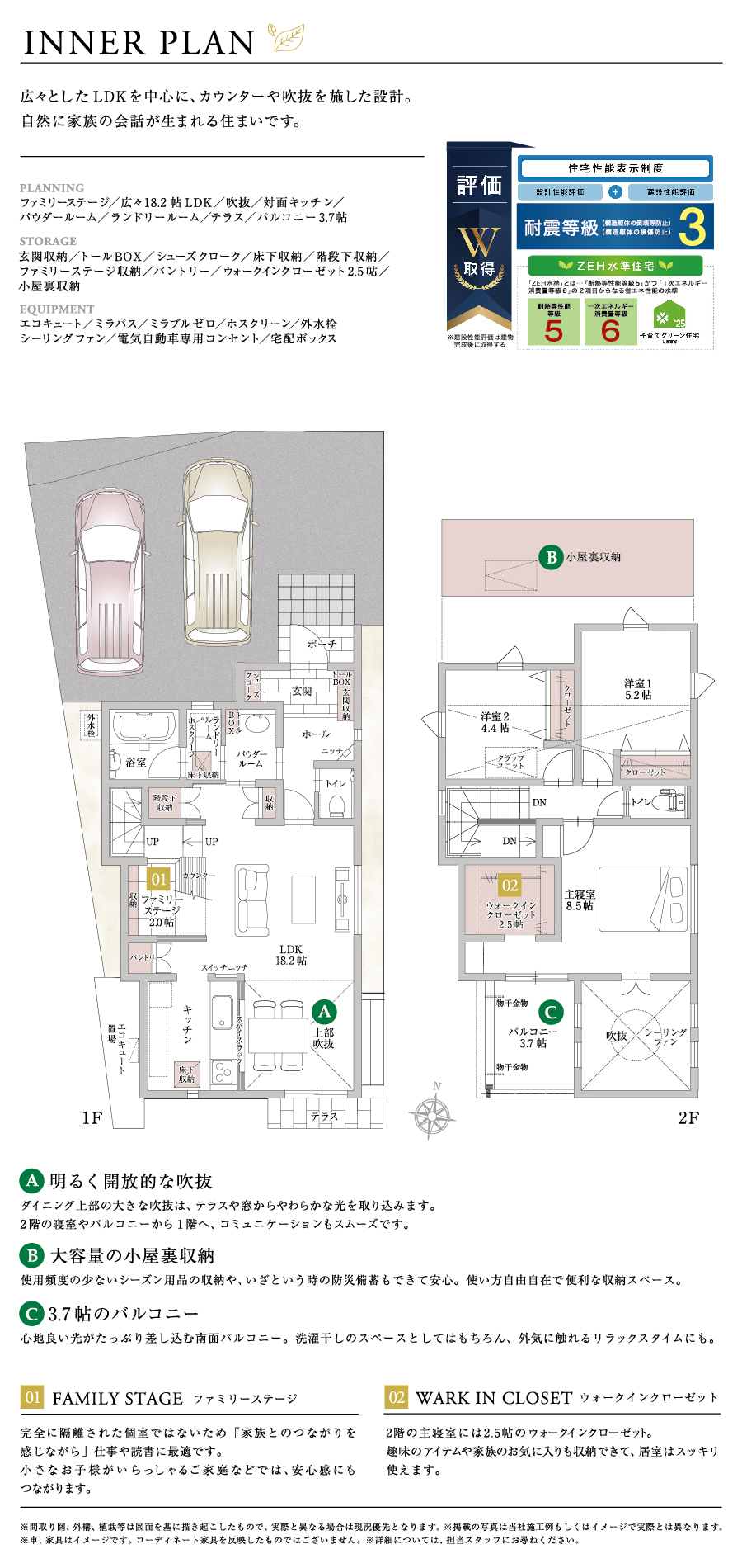 建物構造 木造(在来軸組工法)、ガルバリウム鋼板葺・平形スレート葺、省令準耐火構造、ZEH水準省エネ住宅