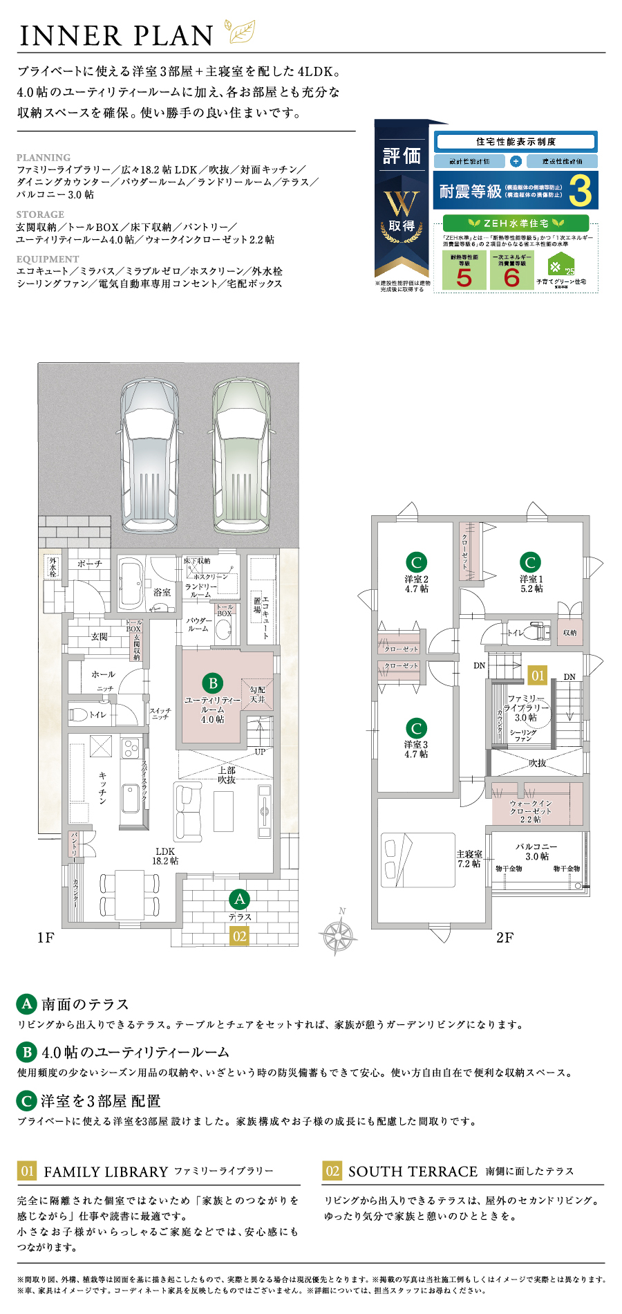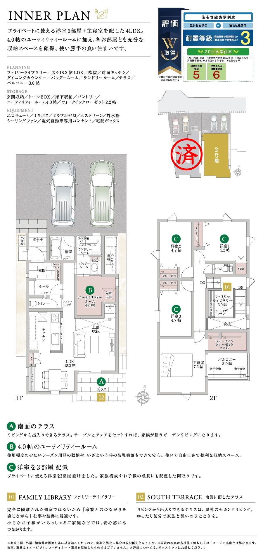設計性能評価&建設性能評価W取得! 国が定めた住宅性能表示制度において、以下の項目で等級を取得しております。 ・耐震等級3(構造躯体の倒壊等防止) ・耐震等級3(構造躯体の損傷防止) ・一次エネルギー消費量等級6 ・断熱等性能等級5