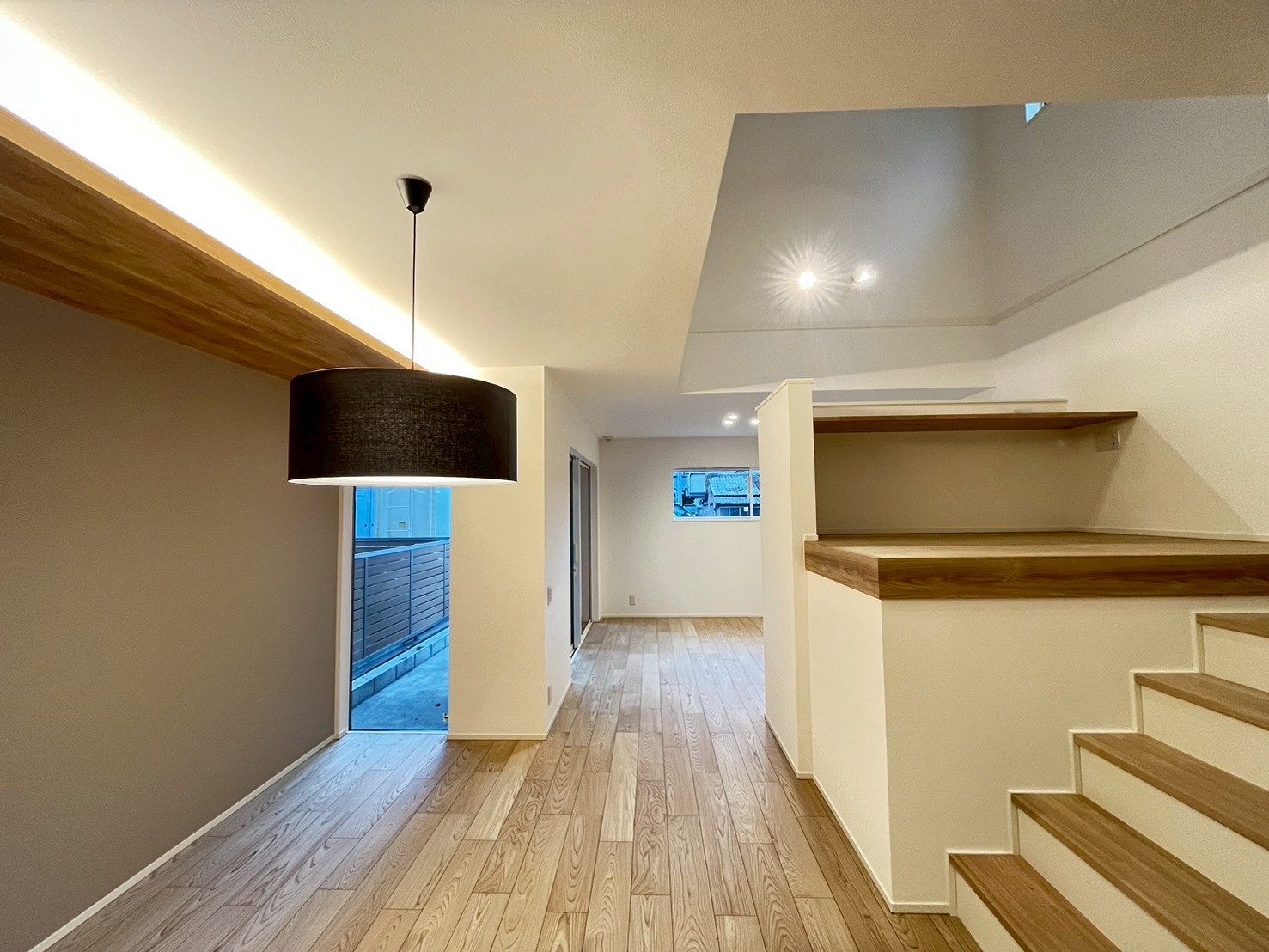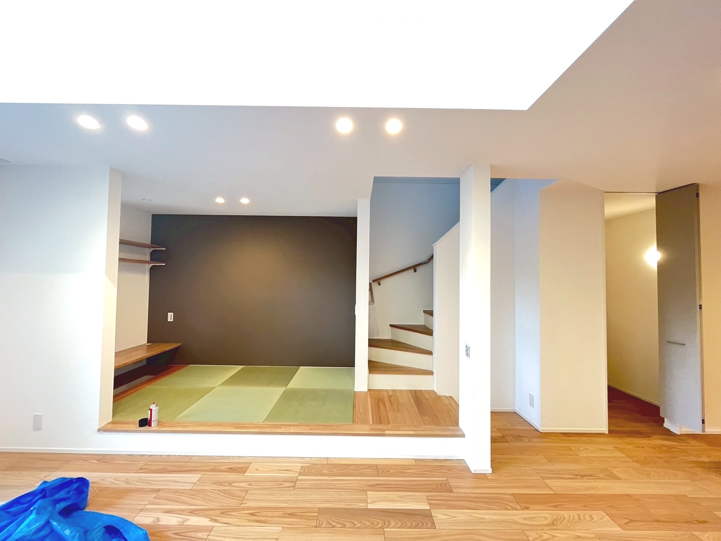 リビング横の小上がり和室は、キッズスペースや昼寝、家事の合間の休憩など多目的に活躍。段差がほどよい区切りとなり、リビングと一体感を保ちながら使い勝手の良い空間です。
