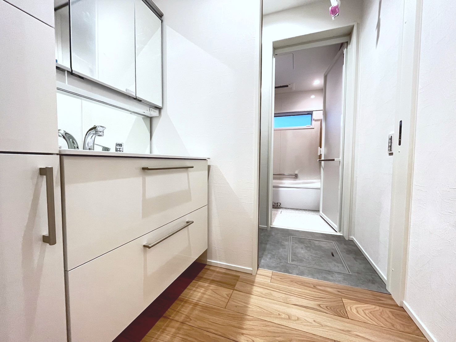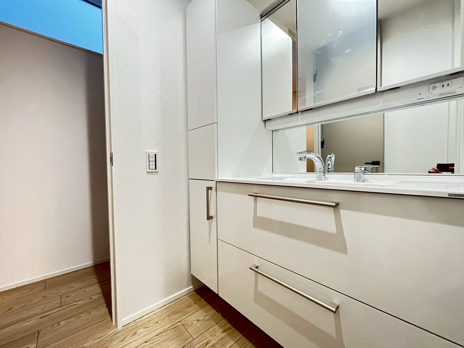 三面鏡付き洗面台は、鏡は両側から引き出せるので、楽な姿勢で使えます。ホスクリーン付きで天候や花粉を気にせず室内干しも◎