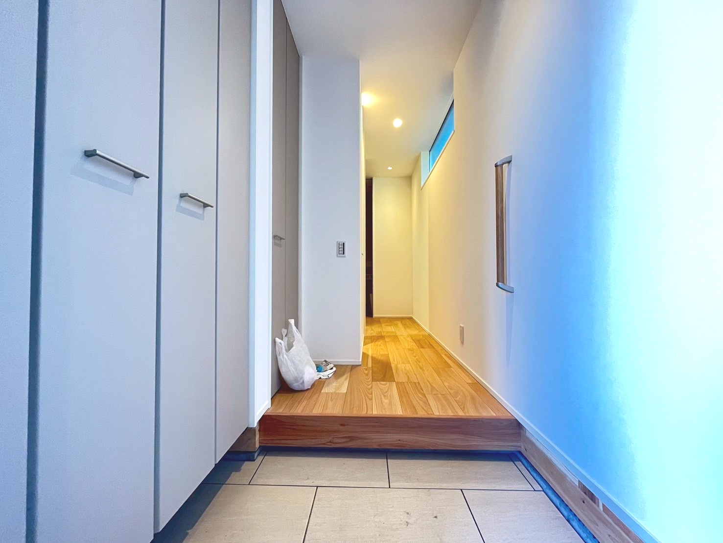 大容量のシューズボックスで、家族みんなの靴もキレイに収納できて玄関まわりはいつもスッキリ。開放的なつくりと上品な雰囲気で、お家に帰るたびにちょっと気分が上がる、そんな玄関です。