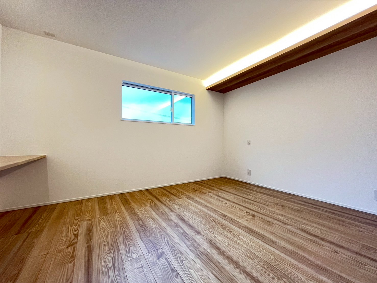 ダブルベッドを置いてもゆとりある広々主寝室。天井の間接照明がやさしく照らし、落ち着いた雰囲気の中で、心地よい眠りへと導きます。