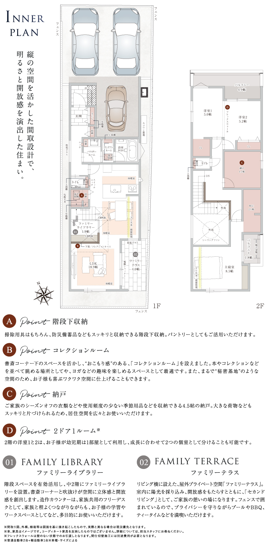 | 備考 | 【1号地】普通自動車2台、軽自動車1台※車種・サイズによる 【3号地】普通自動車2台 |