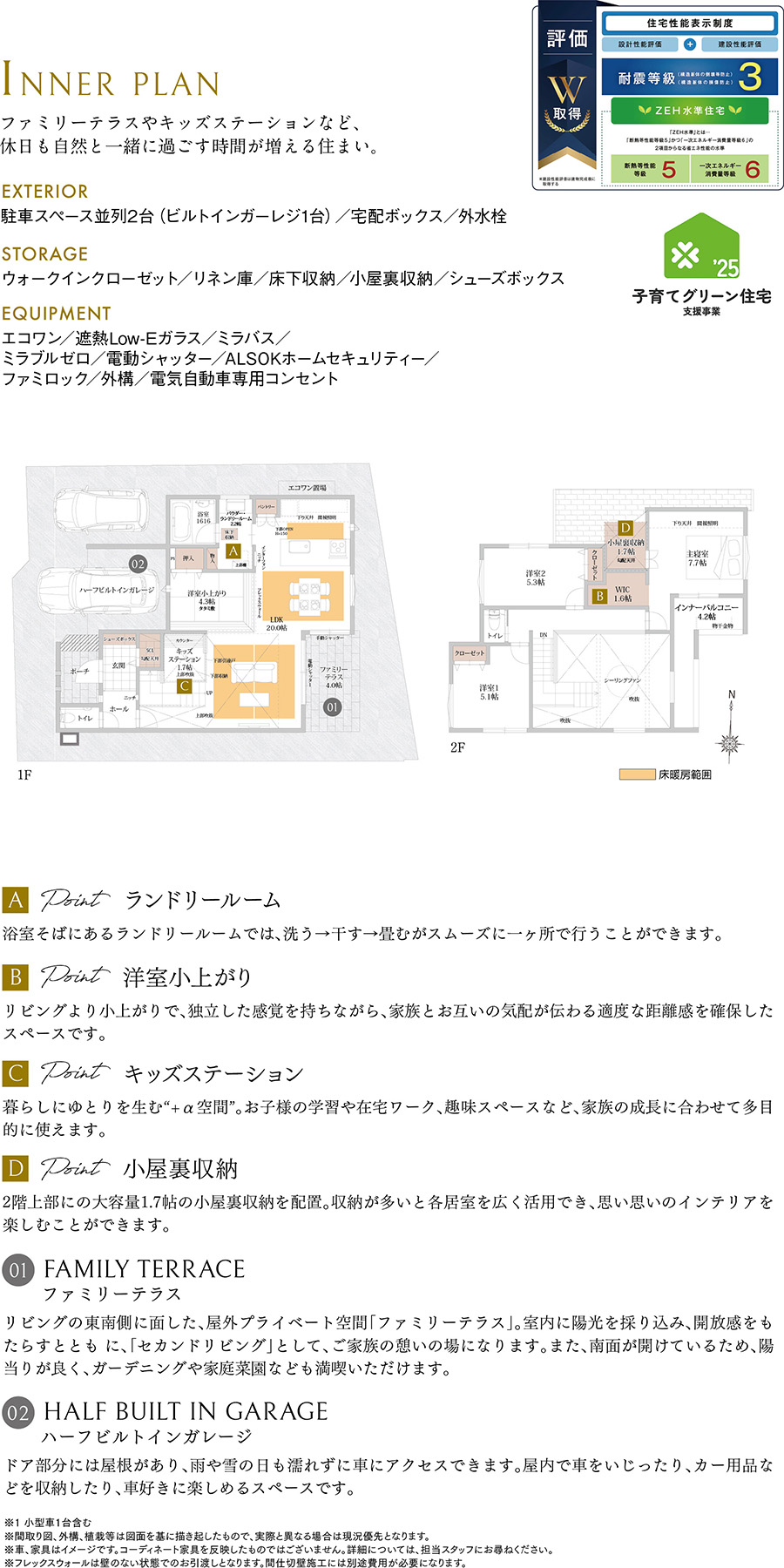 設計性能評価&建設性能評価W取得! 国が定めた住宅性能表示制度において、以下の項目で等級を取得しております。 ・耐震等級3(構造躯体の倒壊等防止) ・耐震等級3(構造躯体の損傷防止) ・一次エネルギー消費量等級6 ・断熱等性能等級5