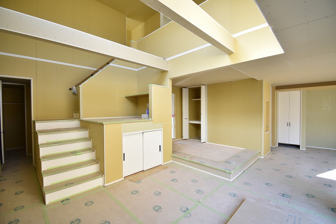 吹き抜け付きの20帖広々リビングには、小上がり和室やキッズステーション・ファミリーテラス等