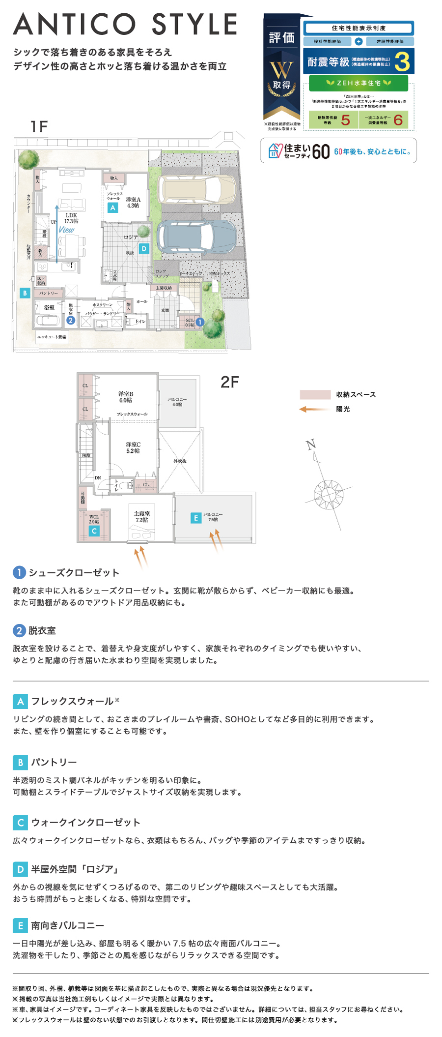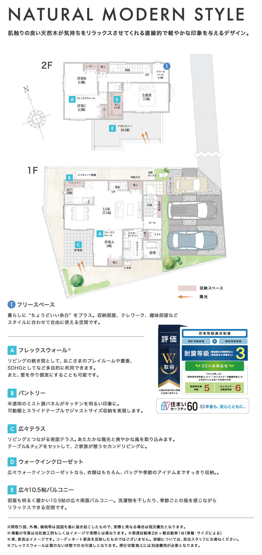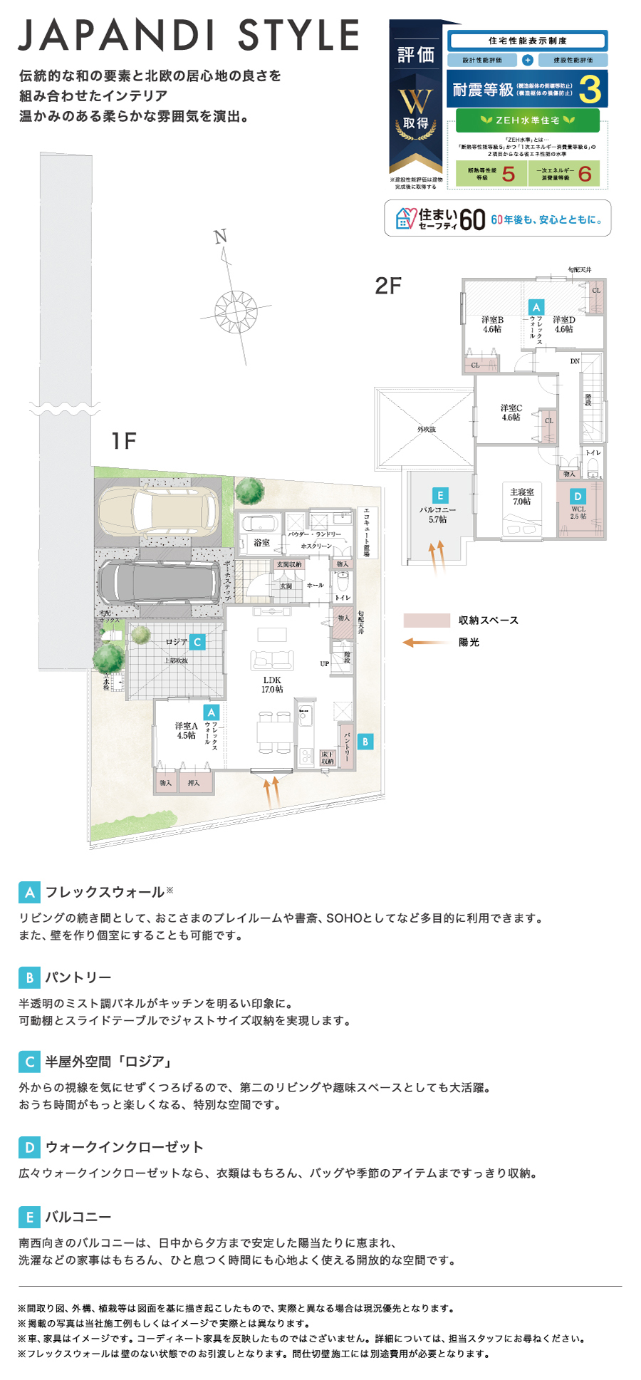 | 建物構造 | 木造(在来軸組工法)、ガルバリウム鋼板葺、省令準耐火構造、ZEH水準省エネ住宅 |