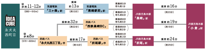 交通 筑豊電気鉄道「三ヶ森」駅徒歩約11~12分、西鉄バス「永犬丸西三丁目」停徒歩約8分