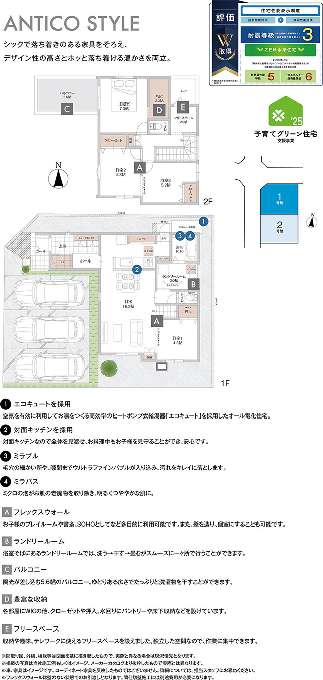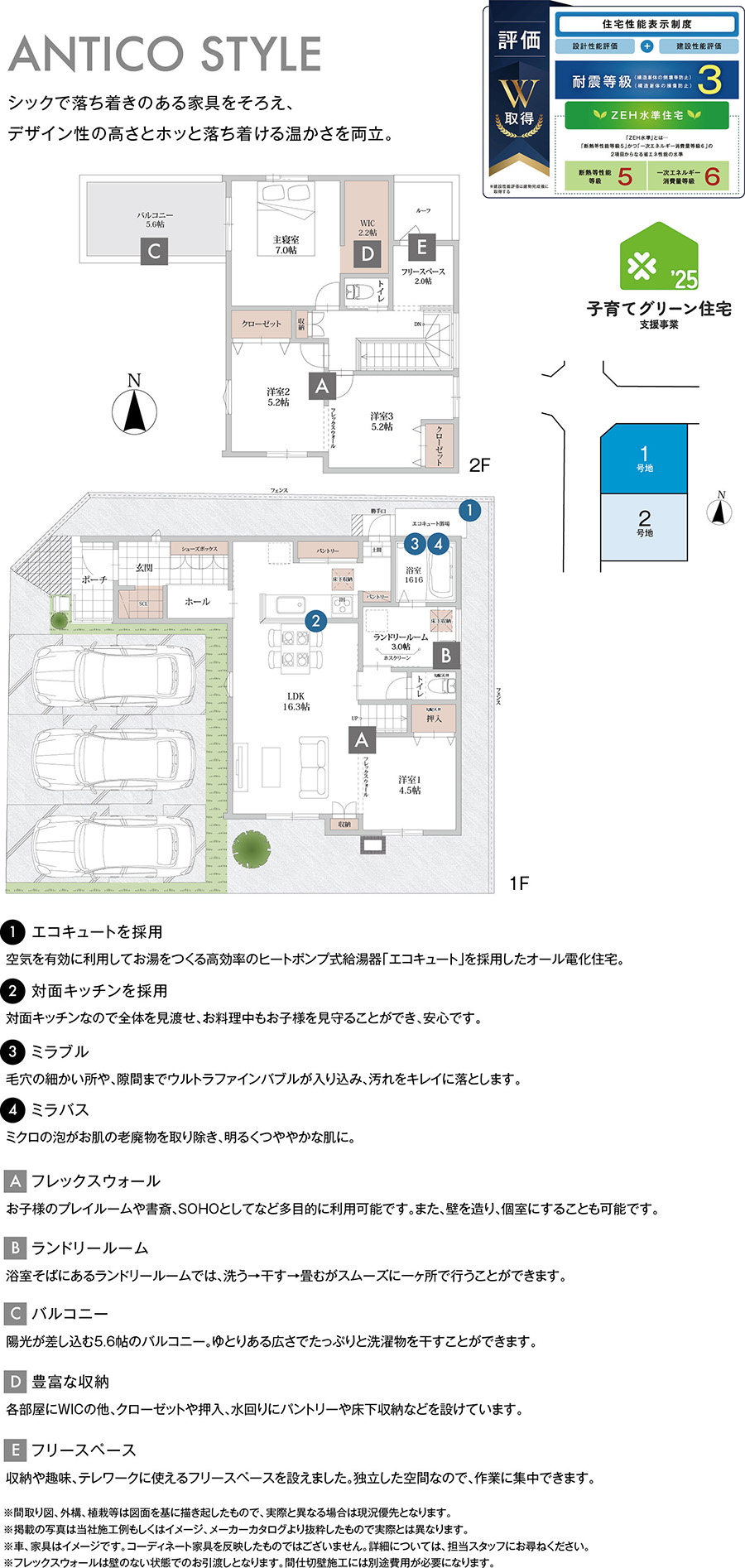 | 建物構造 | 木造(在来軸組工法)、ガルバリウム鋼板葺、省令準耐火構造、ZEH水準省エネ住宅 |