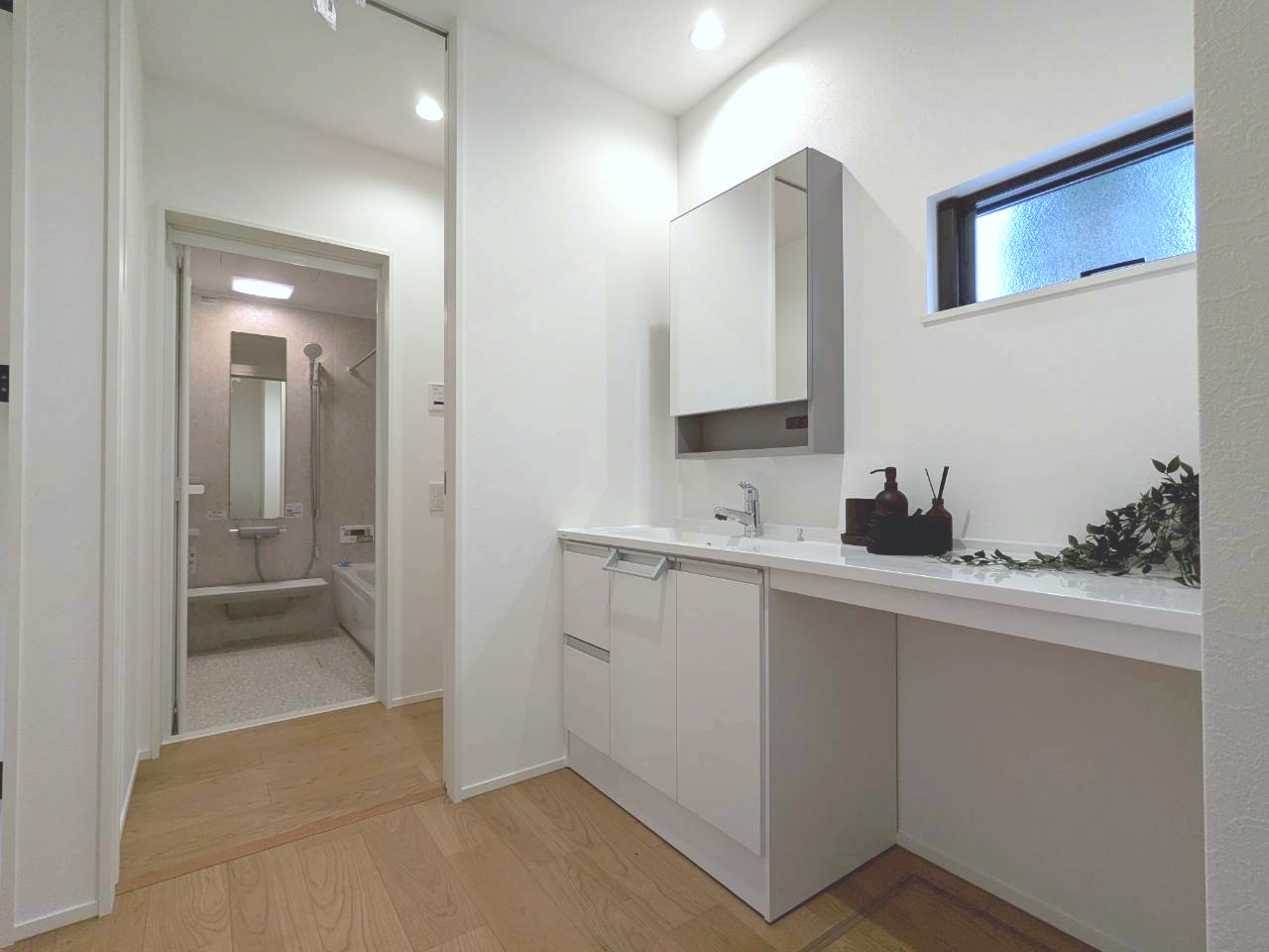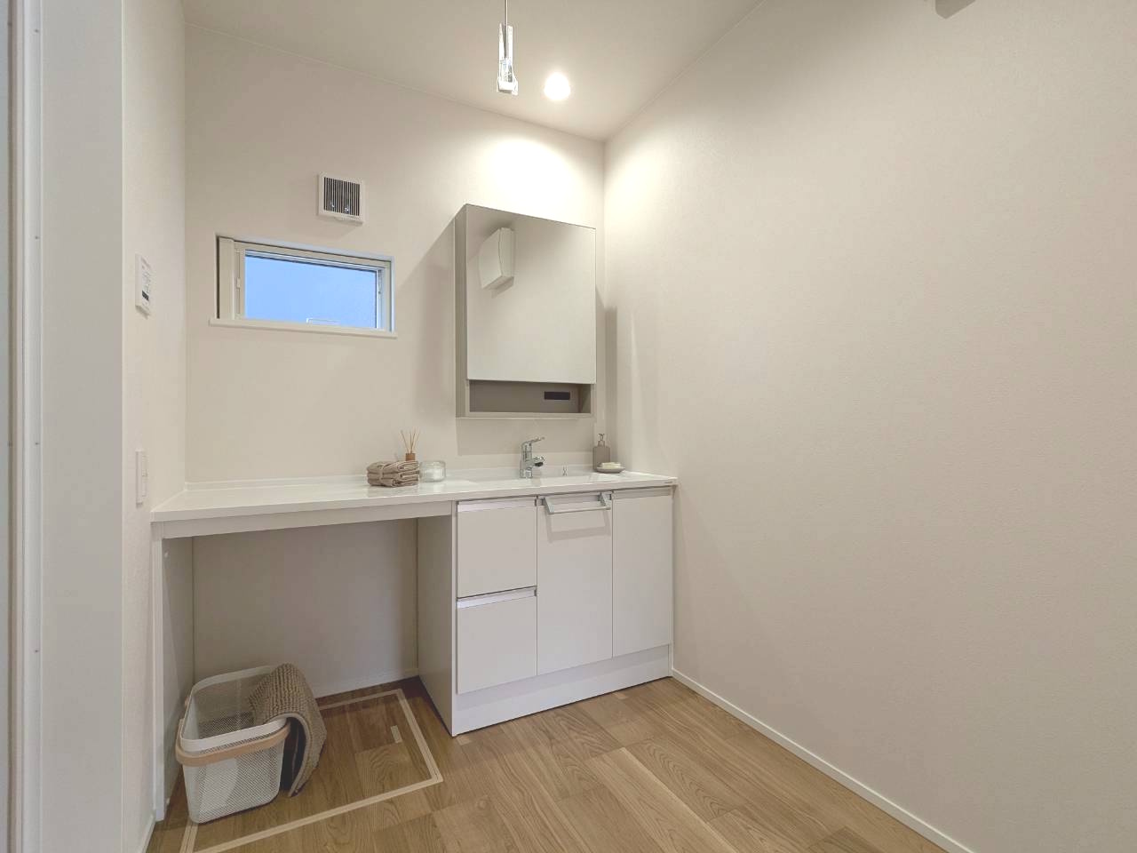 ワイドカウンター付きの洗面台を備えた洗面室は、家族みんながゆったり使える快適な空間。朝の身支度や洗濯作業もスムーズにこなせます🌟