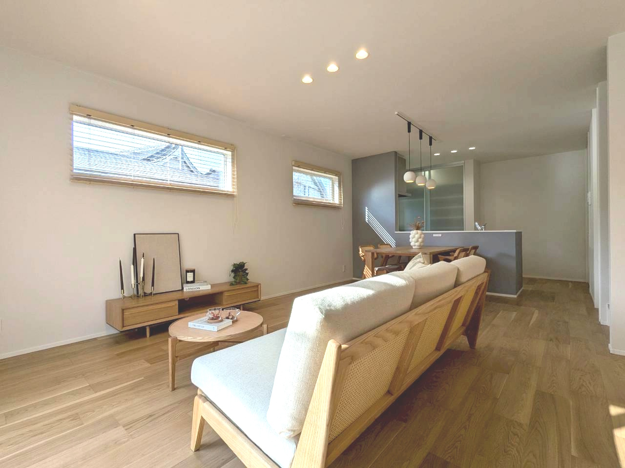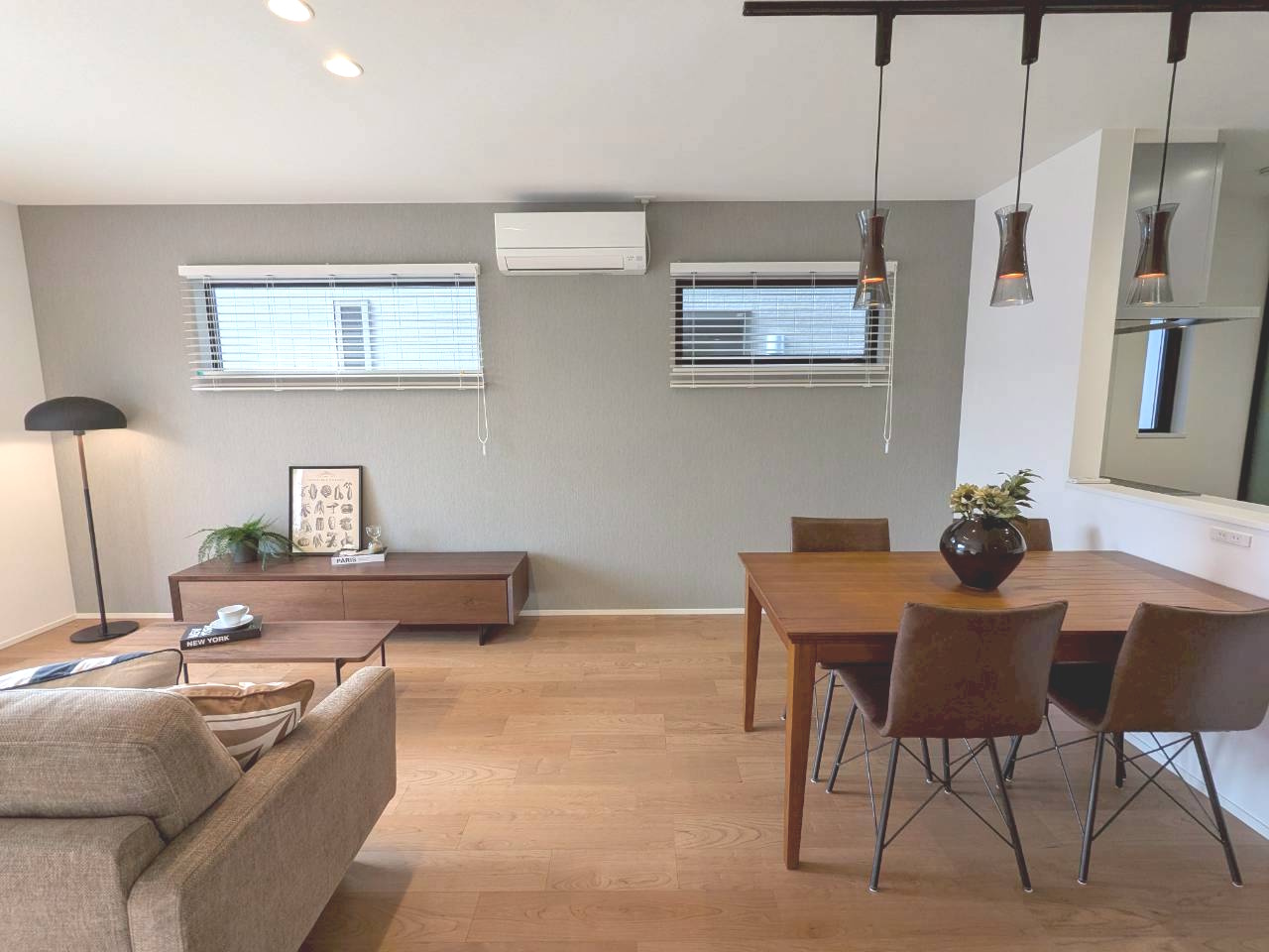 建売住宅ながら1邸1邸コンセプトに合わせたお部屋の雰囲気が魅力のひとつです✨1号地とは異なり、落ち着きとぬくもりのある印象で、家族みんながゆったりくつろげる団らん空間です🏠