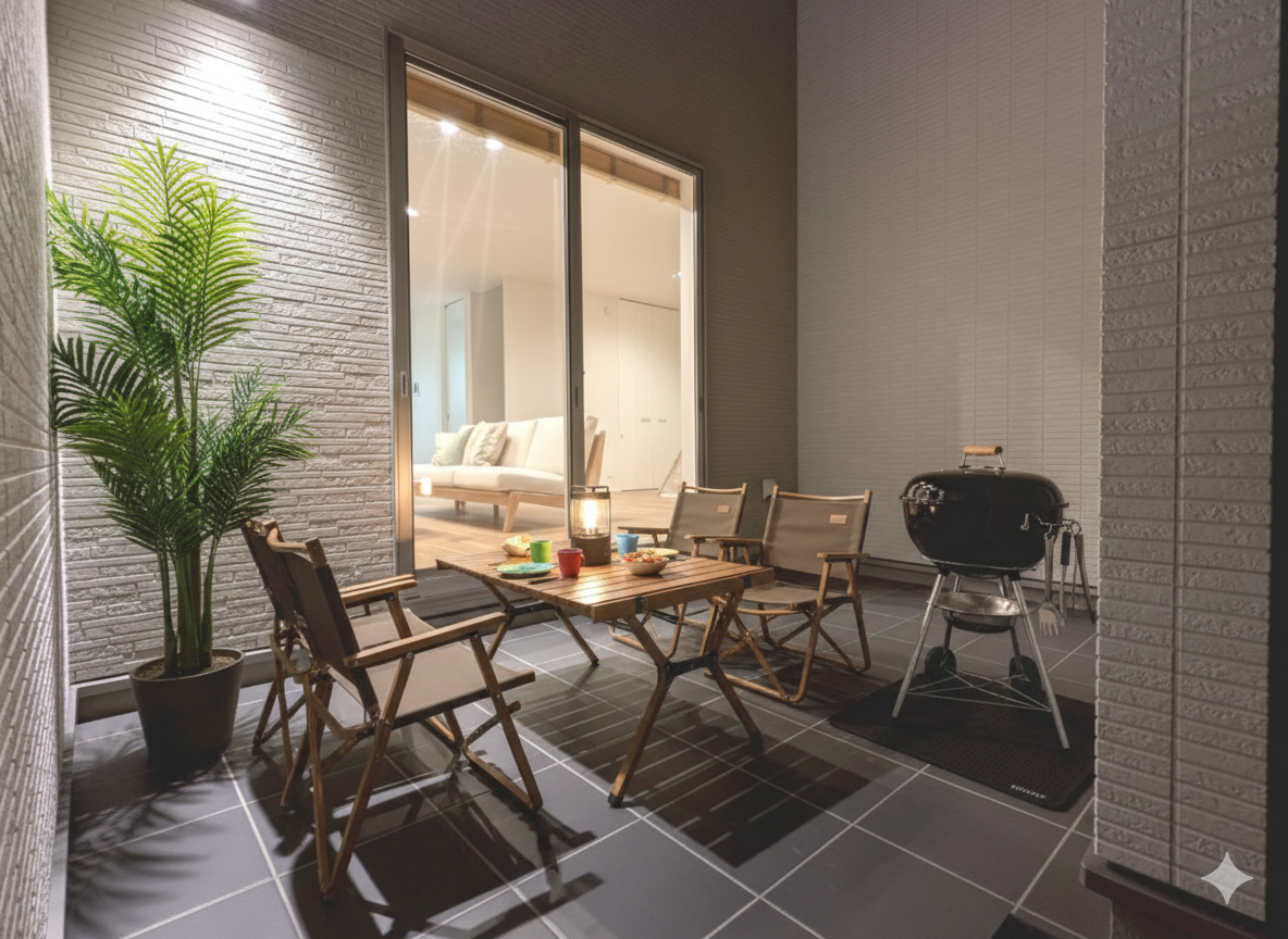 バーベキューや軽い食事、家族や友人との団らんなど、屋外ならではの楽しみ方が広がります。星空や夜風を感じながら、住まいの中とはひと味違う、アクティブで特別な時間を演出します🌟