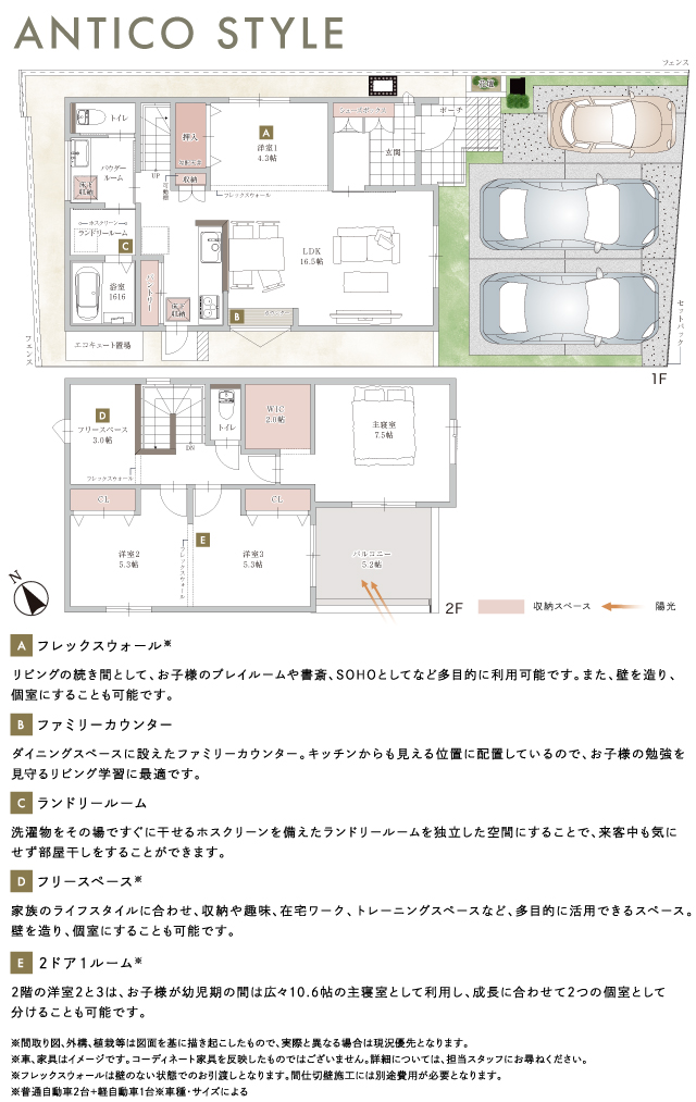 | 備考 | 【1号地】普通自動車2台、軽自動車1台※車種・サイズによる 【2号地】普通自動車3台 |