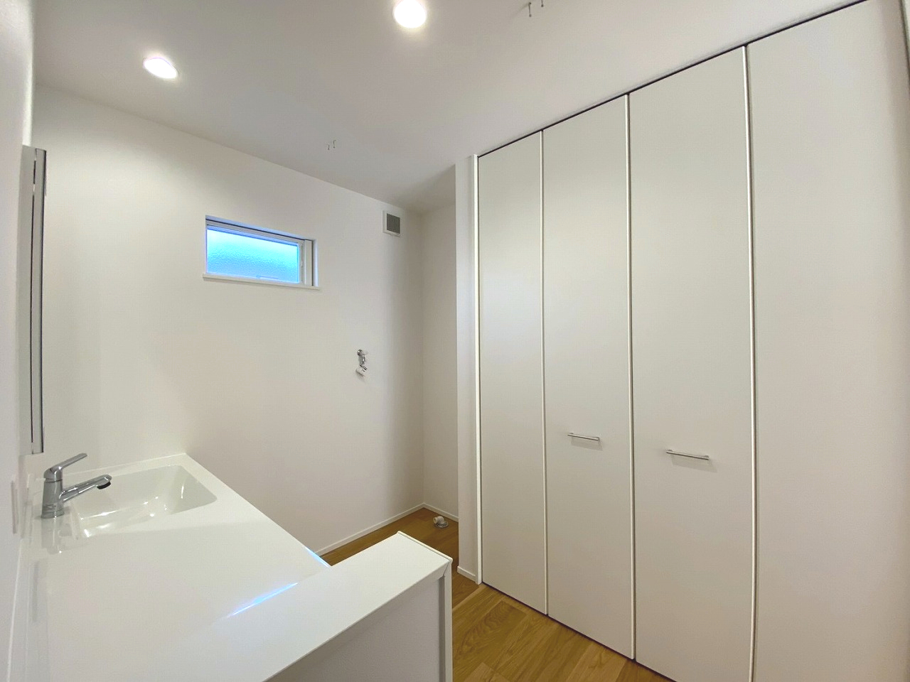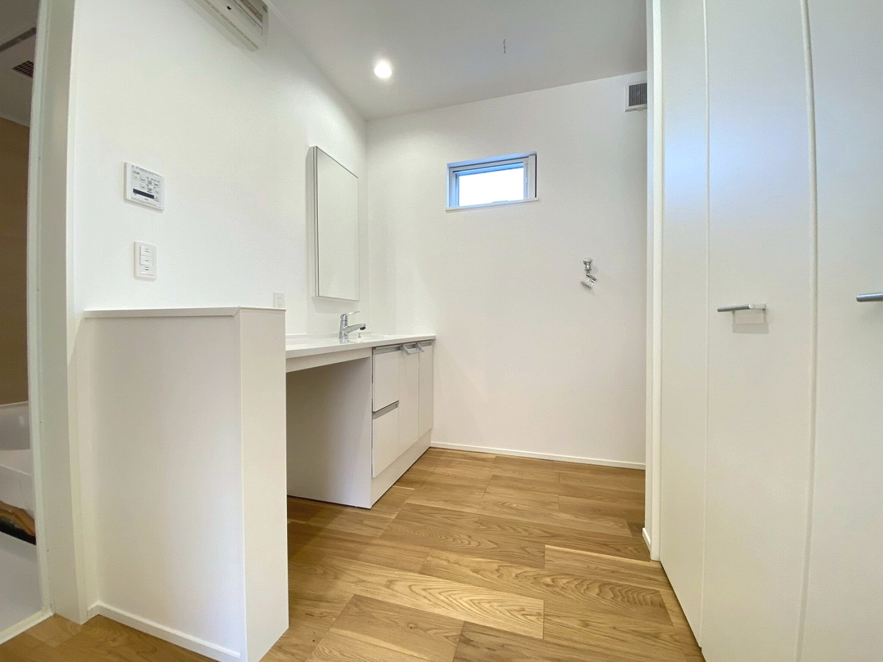ワイドカウンター仕様の洗面台は、家族で並んで朝の支度ができる他、アイロンがけなどの家事スペースとしても活躍✨