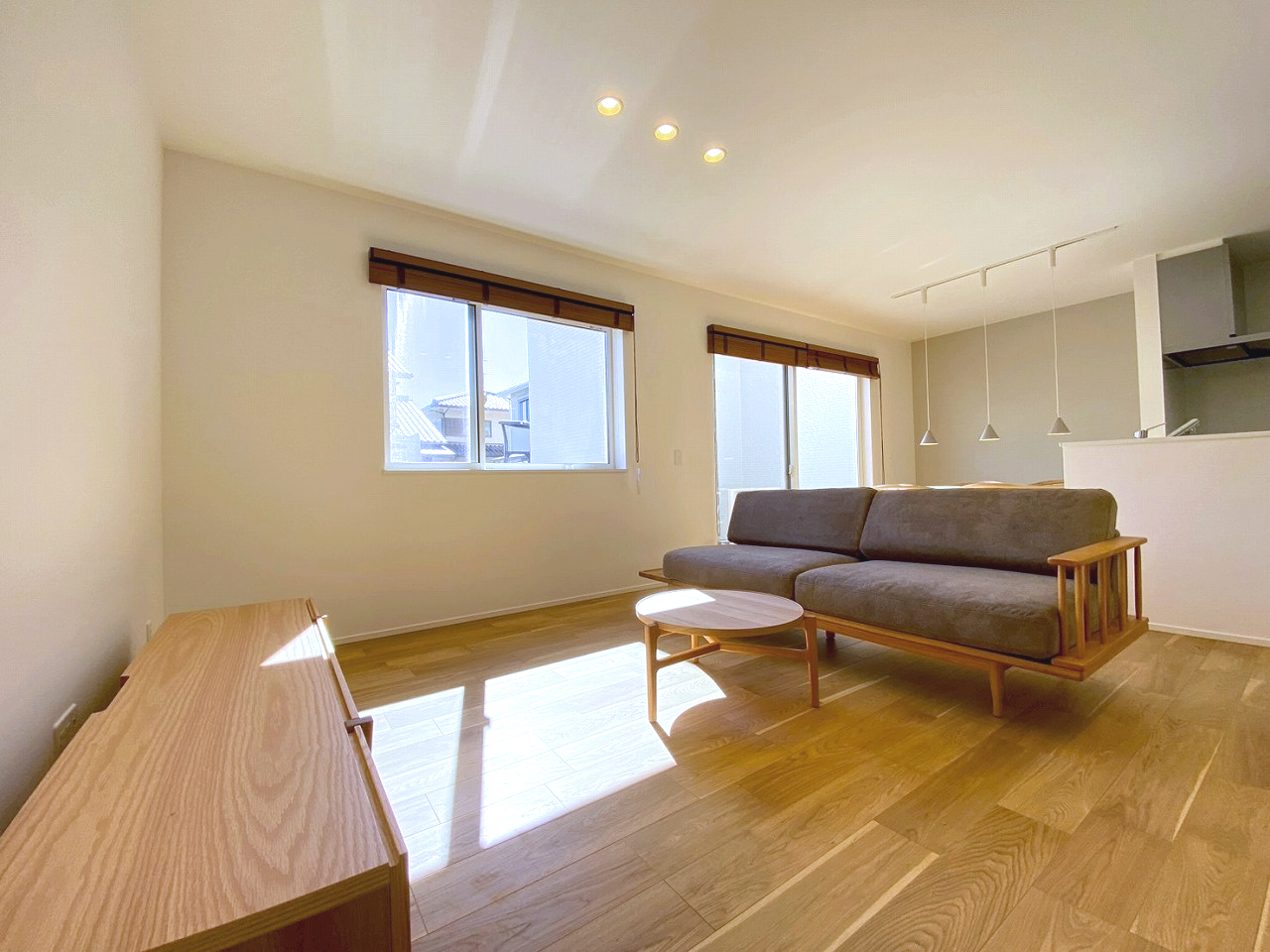 南向きで一日を通して陽が差込む明るいリビングルーム🌿家族が自然と集まる工夫が詰まっています☘️