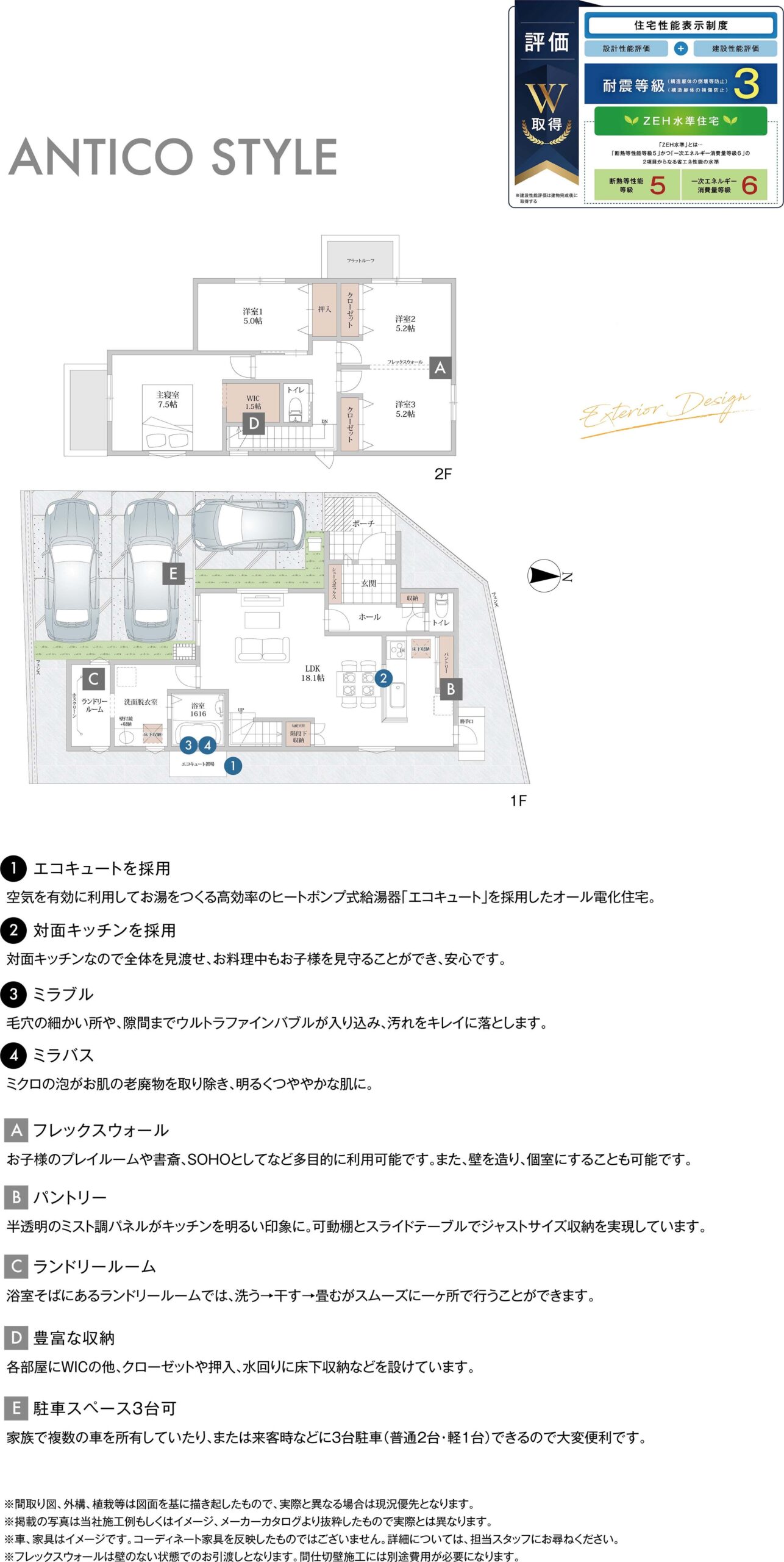 | 建物構造 | 木造(在来軸組工法)、ガルバリウム鋼板葺、省令準耐火構造、ZEH水準省エネ住宅 |