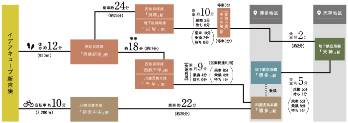 ※電車所要時間は通勤時、()内は日中平常時のもので、時間帯により異なります。また、乗り換え、待ち時間を含んでおります。