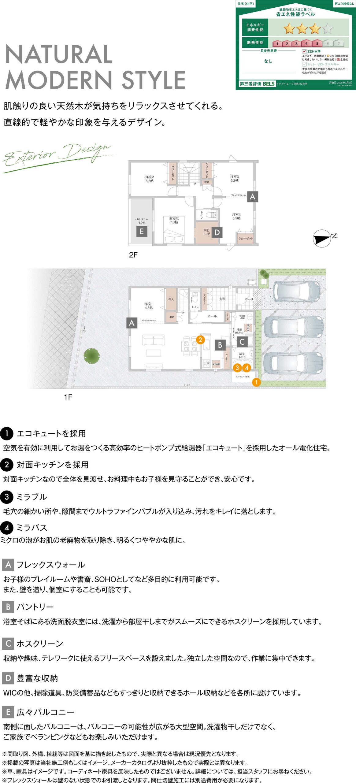 | 建物構造 | 木造(在来軸組工法)、ガルバリウム鋼板葺、省令準耐火構造、ZEH水準省エネ住宅 |