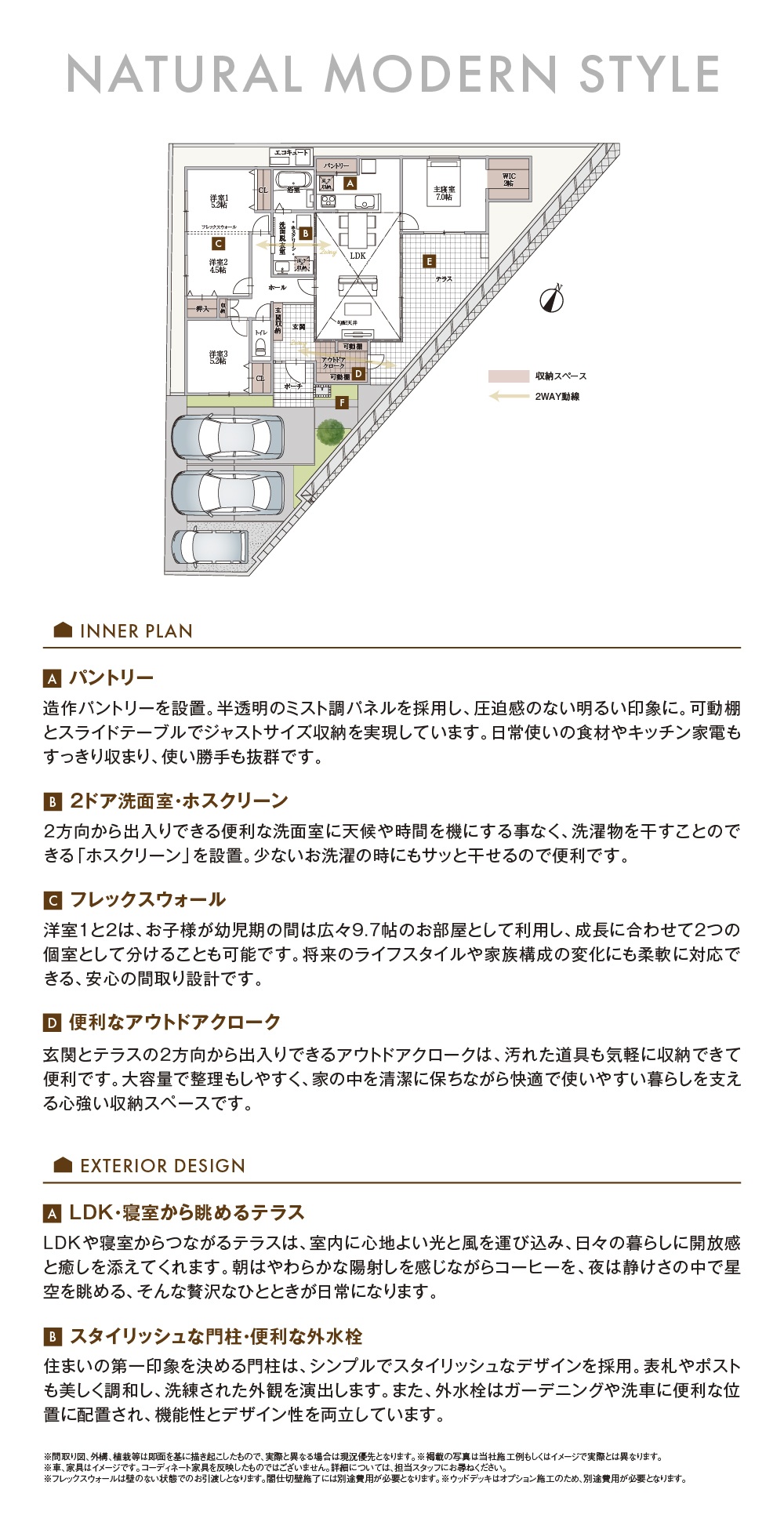 | 建物構造 | 木造(在来軸組工法)、ガルバリウム鋼板葺、省令準耐火構造、ZEH水準省エネ住宅 |