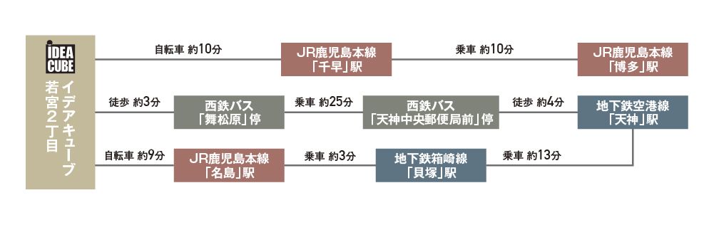 ※電車所要時間は通勤時、()内は日中平常時のもので時間帯により異なります。また、乗り換え、待ち時間を含んでおります。