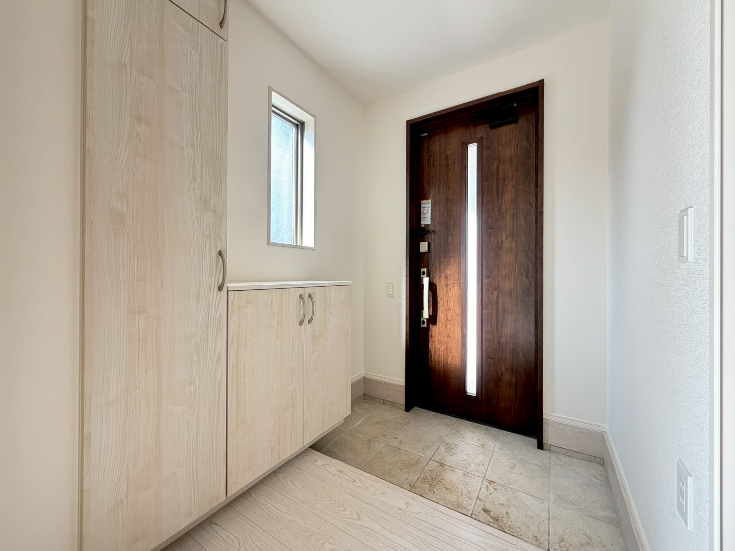 窓からの陽光が差し込み、あかるく開放的な玄関。並んで準備ができる広さが魅力✨また収納も豊富で、ご家族分のシューズをすっきり収納いただけます👟