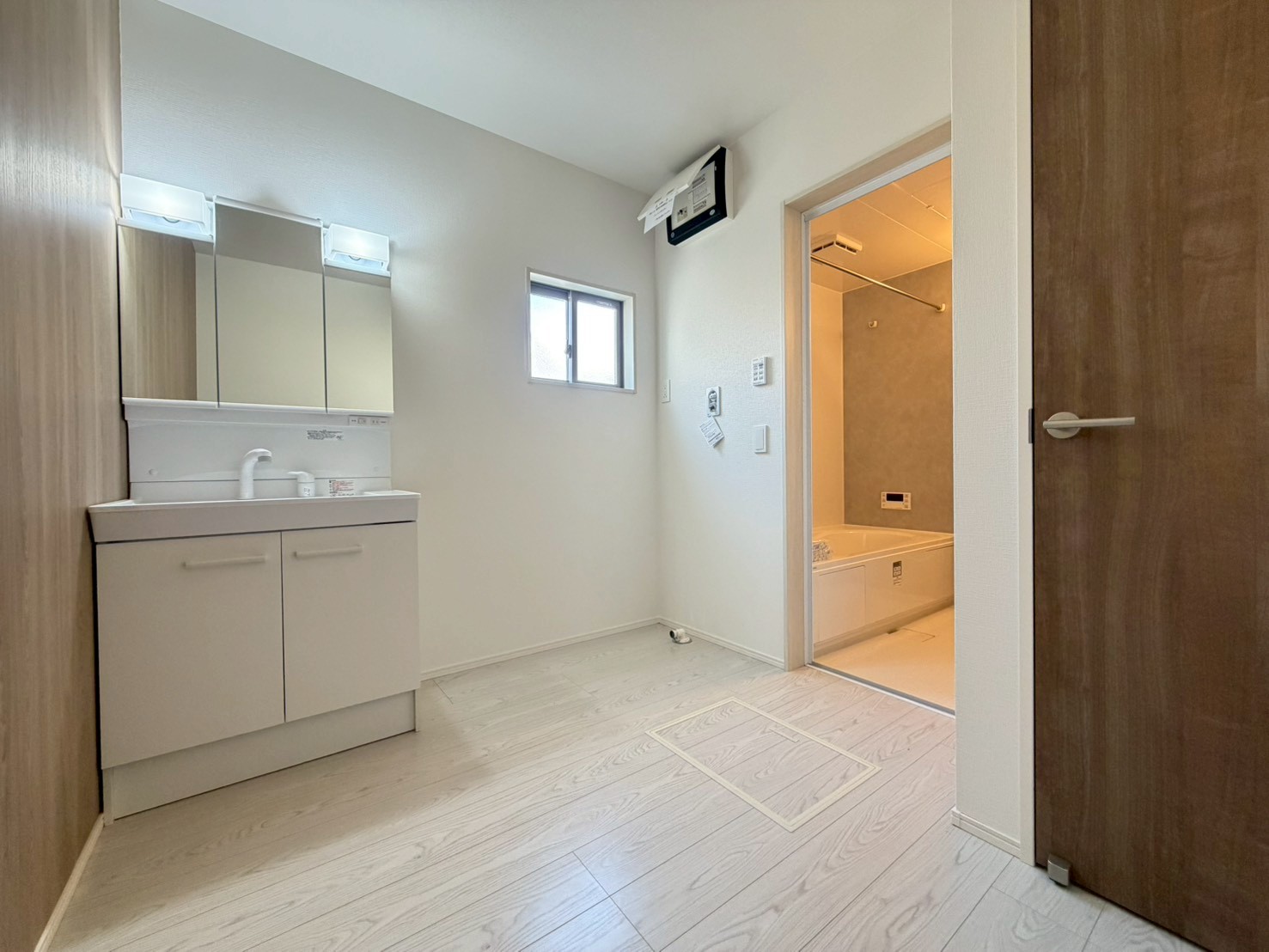 広々の洗面脱衣室。朝の渋滞時間も安心の広々設計!◎女性に嬉しい三面鏡付の洗面台は、収納も豊富!日用品のストックもしっかり収納いただけます🌟