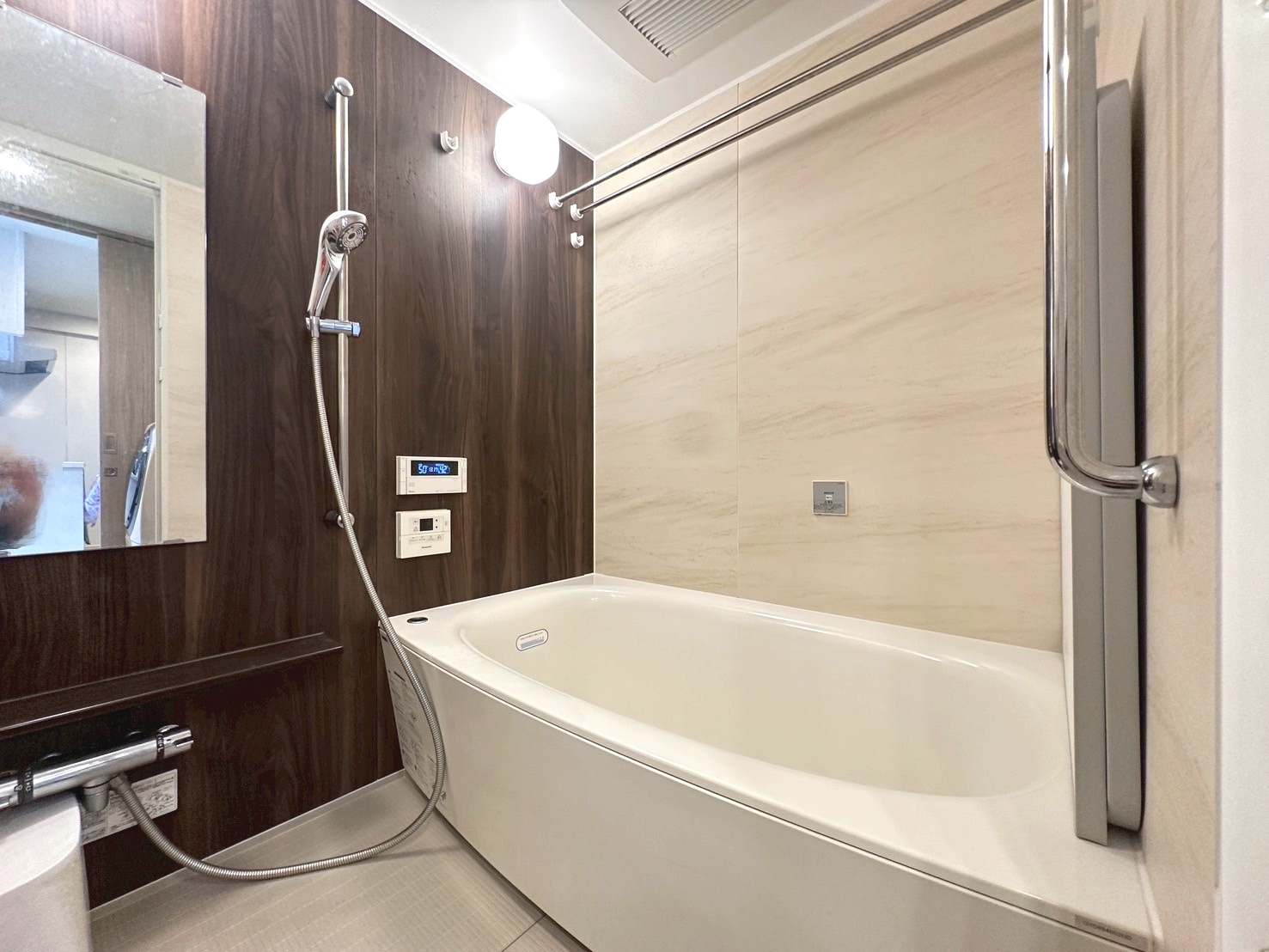 ミスト機能付きの浴室暖房乾燥機を備え、快適なバスタイムをサポート。浴室テレビも設置されており、リラックスしながら入浴を楽しめます🌼機能性とくつろぎを兼ね備えた上質なバスルームです🛁
