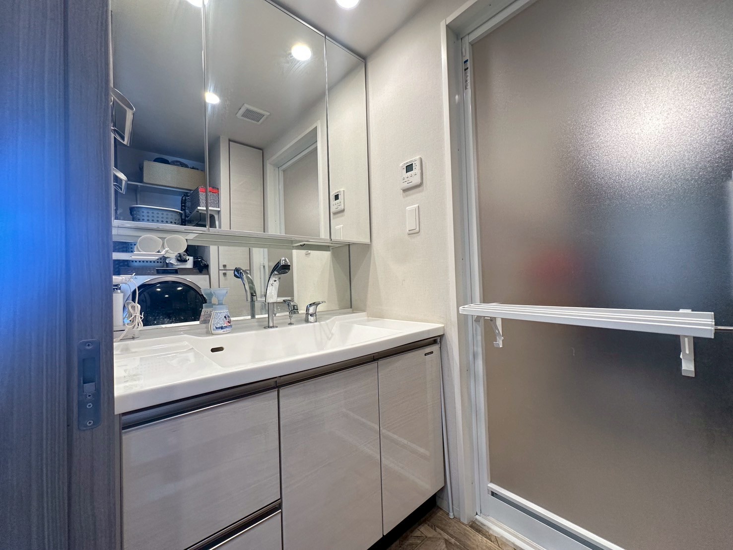三面鏡付き洗面台を備えた使い勝手の良い空間✨鏡裏収納も充実し、日用品をすっきり整理可能◎さらにお子様の目線に合わせた鏡も設けられており、家族みんなが使いやすい工夫が施されています😊