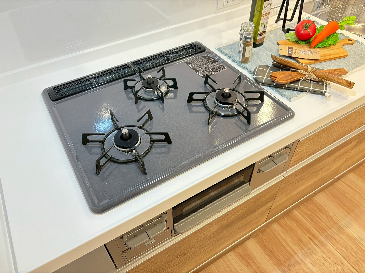 同時調理ができる3口ガスコンロで、忙しい毎日も効率よくお料理。家族の食卓を支える頼れるキッチン設備です☘️
