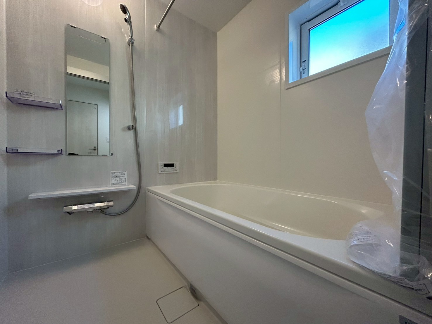 ゆったりとしたバスルームは、一日の疲れを癒すリラックス空間。滑らかな曲線の浴槽は身体にフィットし、心地よい入浴時間を演出します。浴室暖房乾燥機を備え、雨の日の洗濯物も安心。カビの発生も抑えやすく、お手入れも簡単。家族みんなが快適に使える、清潔感と機能性を兼ね備えた浴室です🛁
