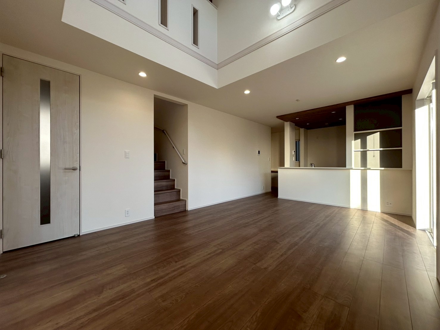 18.5帖の広さと、上部吹抜けの開放感が魅力のリビングです。