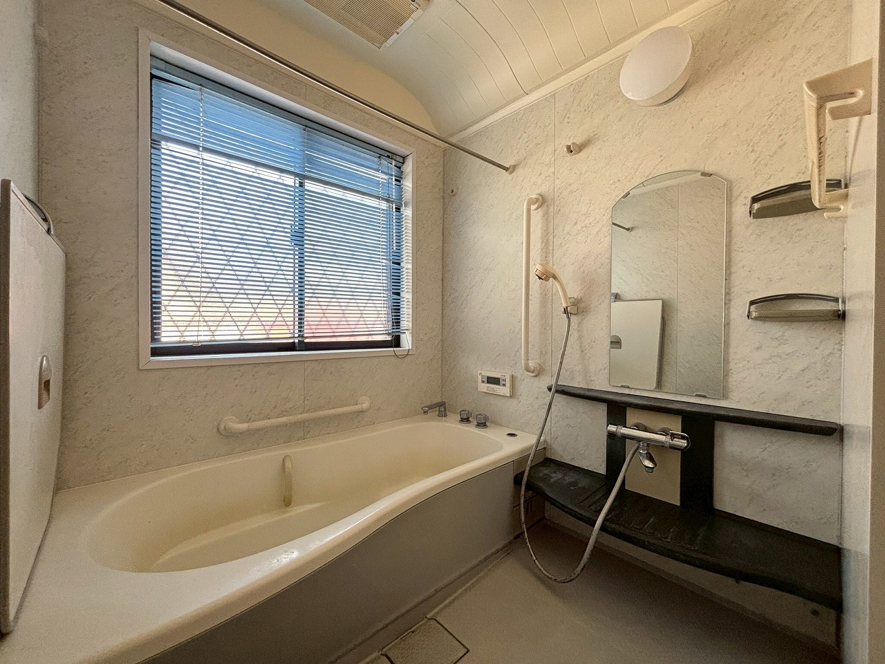 窓付きで換気しやすく、手すりも付いた安心設計のバスルーム🛁