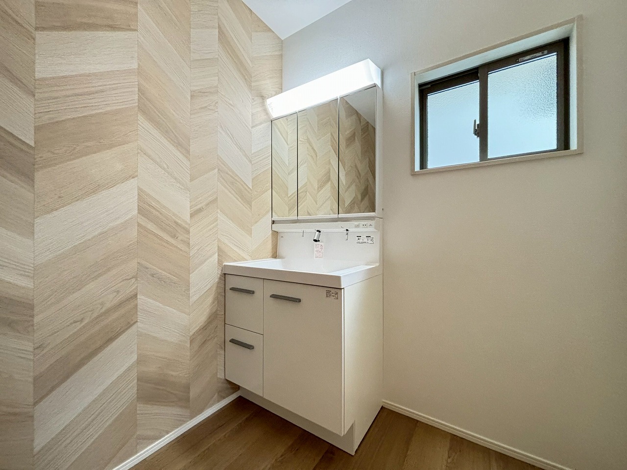三面鏡付き洗面台は、鏡裏収納でスッキリ収納可能✨
